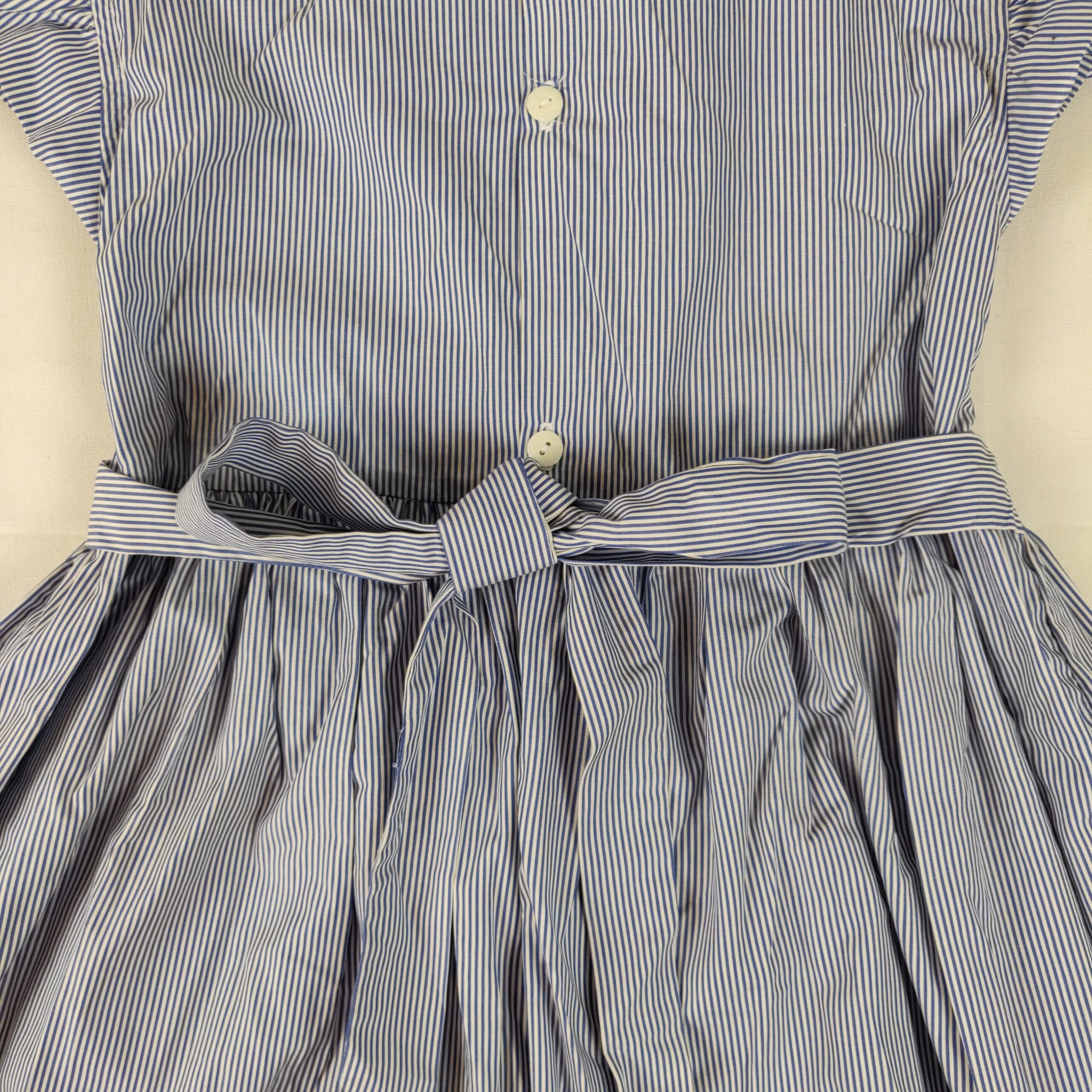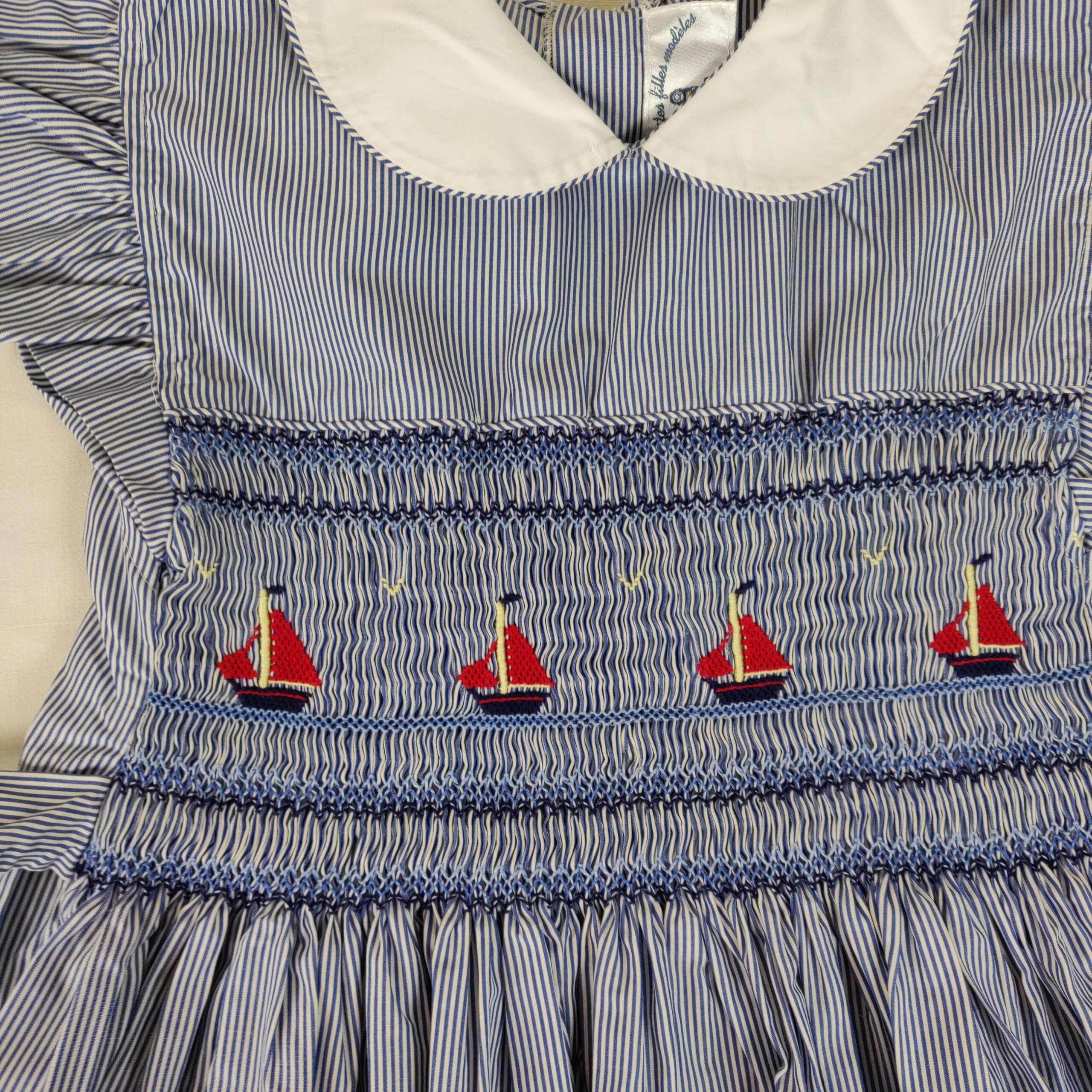 Autres commentaires : Robe à smocks, col claudine à bords à liserés, manches courtes à volants. Bateaux bleus, blancs et rouges et mouettes brodés sur les superbes smocks. Ceinture à l’arrière, fermeture par 3 boutons nacrés au dos. Magnifique travail.