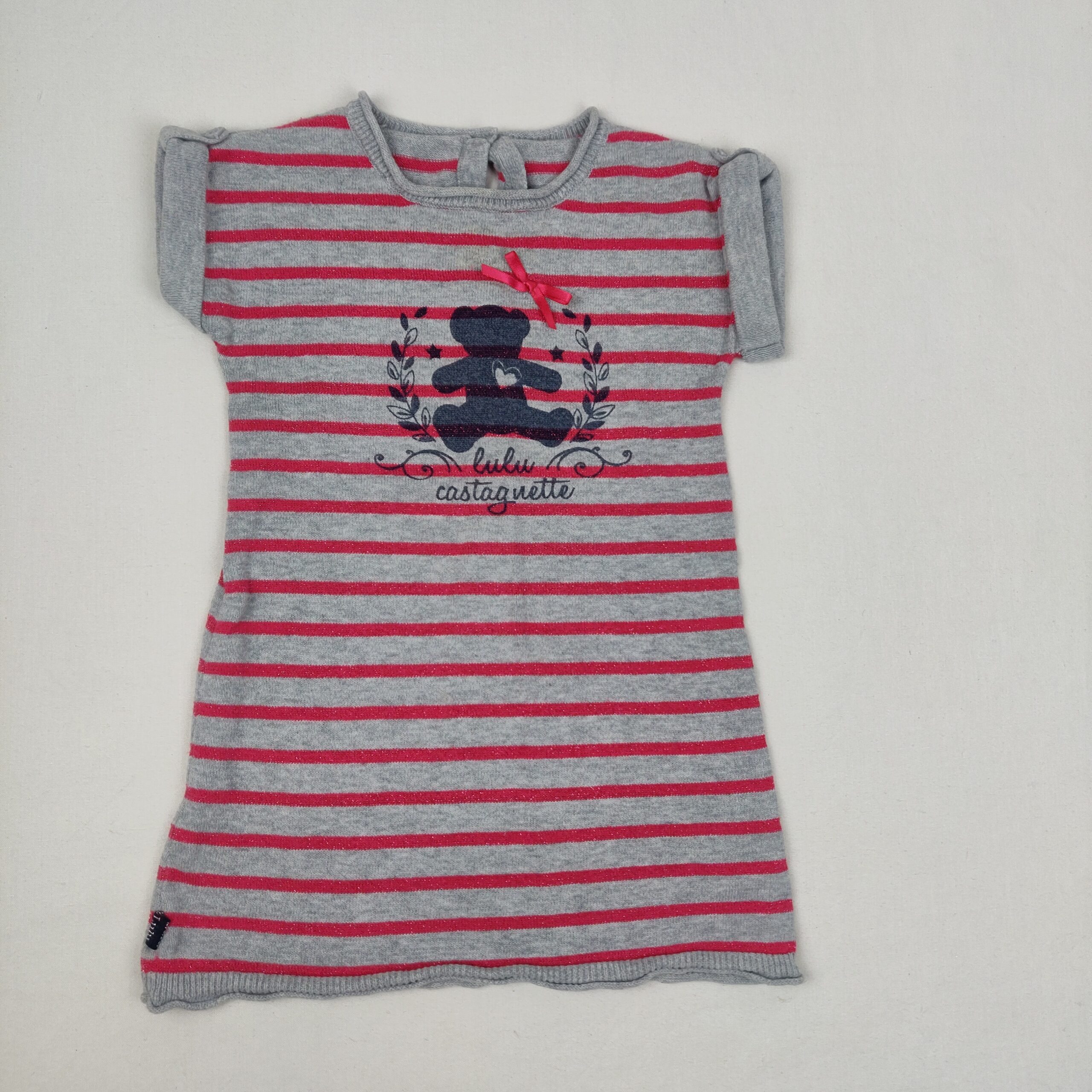 Autres commentaires : Robe en maille gris clair rayée rose pailleté à manches courtes avec revers , col rond, ouverture dans le dos par boutons classiques, motif central silhouette nounours et inscription bleu foncé « lulu castagnette » (matière principale : 94% coton, 4% polyester, 2% métallisé)