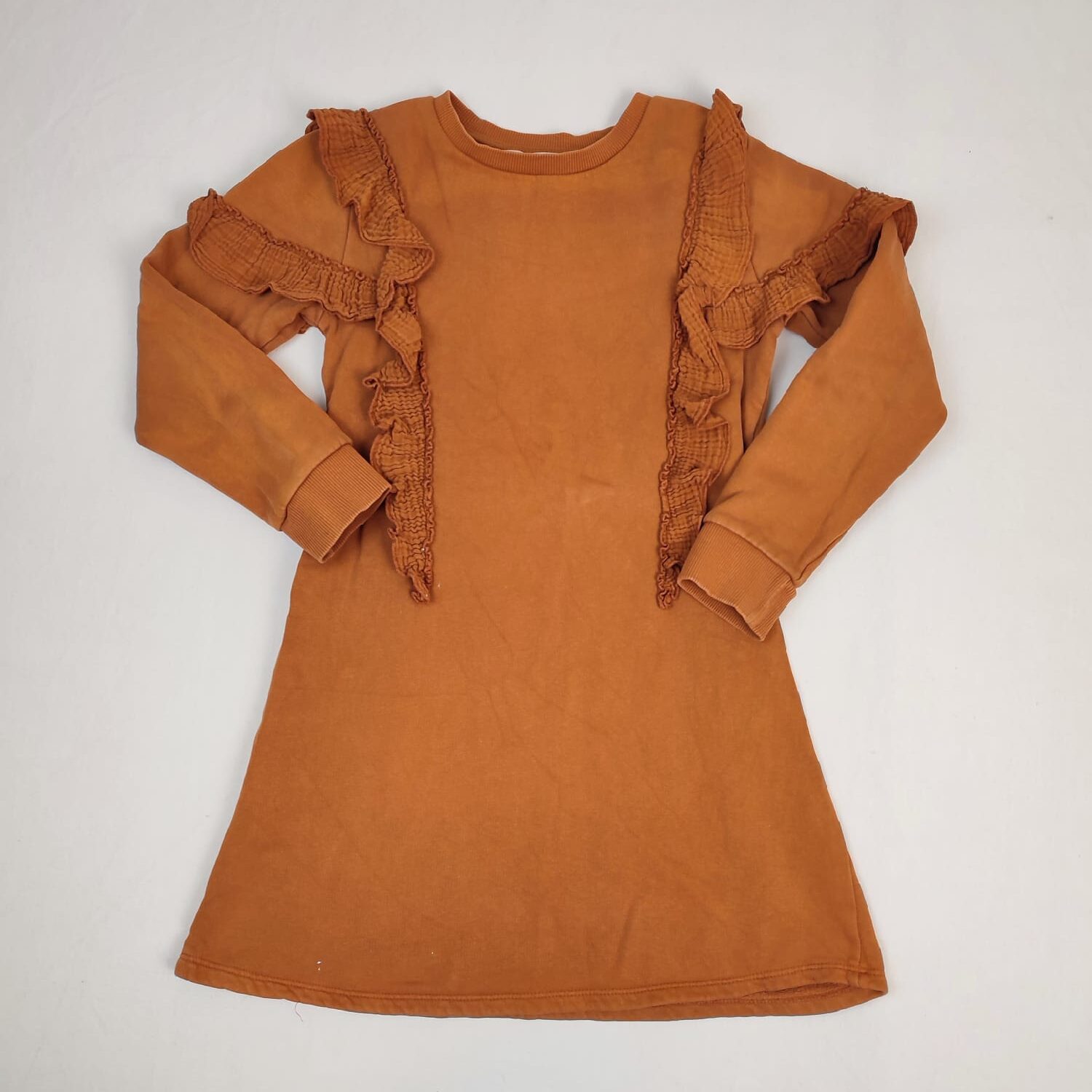 Autres commentaires : Robe caramel à manches longues, en coton éponge avec volants devant et épaules, forme légèrement trapèze en bas.