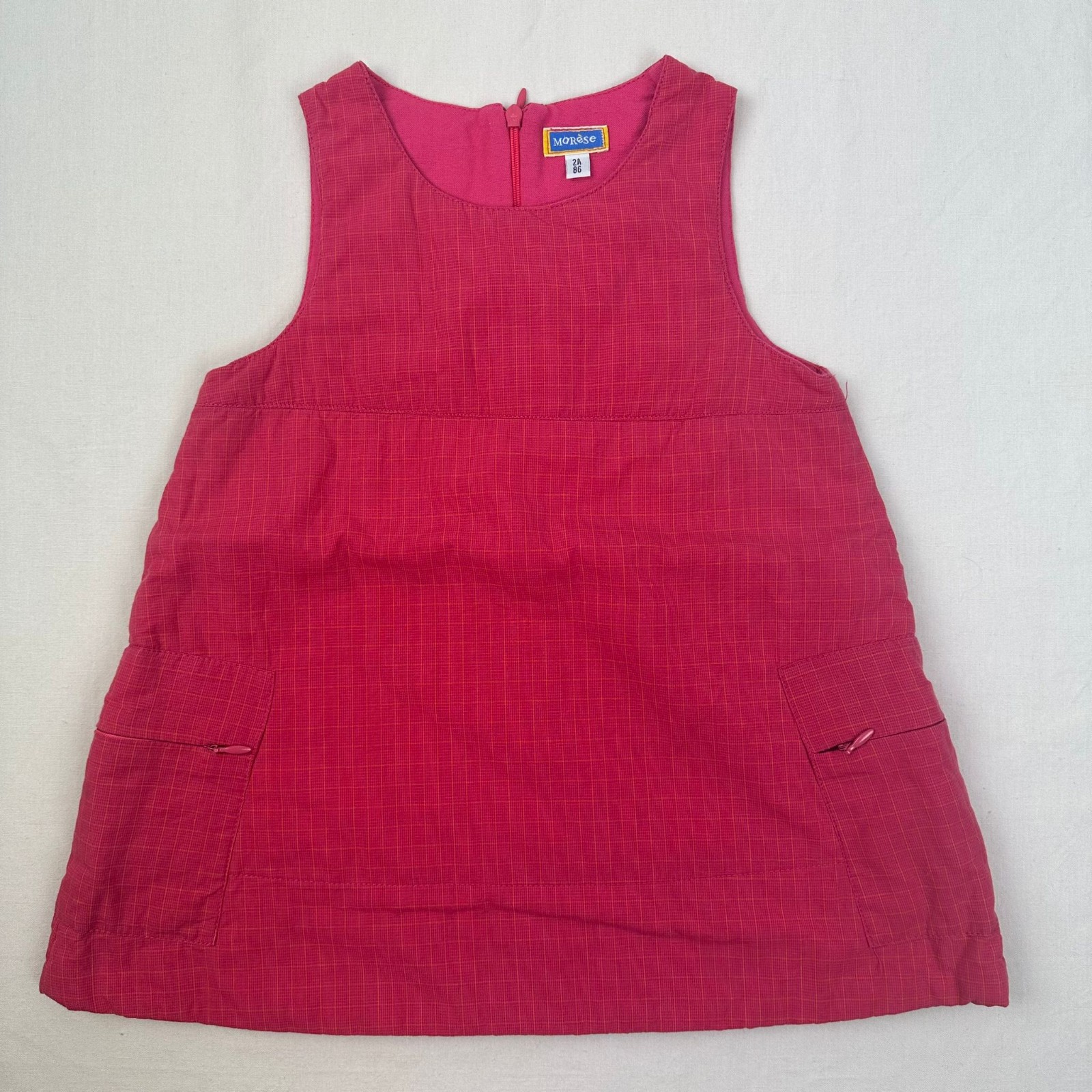 Autres commentaires : Doublure: Coton 100%. Robe rose sans manches en carréaux fines jaunes avec doublure et une fermeture au dos en zip.