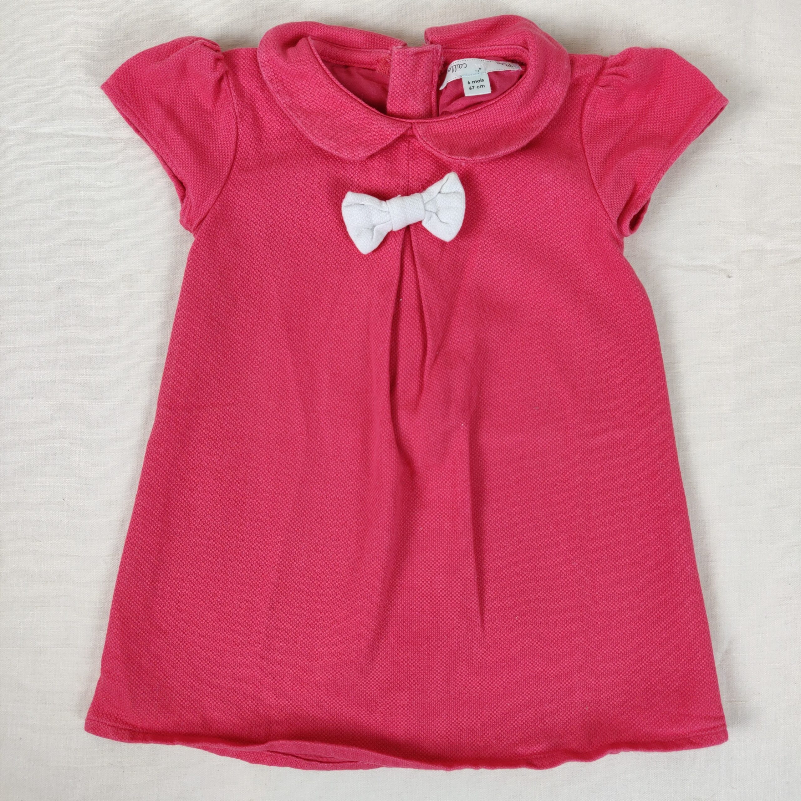 Autres commentaires : Robe à manches courtes de couleur rose corail avec col claudine et noeud blanc, pli central devant et ouverture par fermeture éclair en haut du dos.