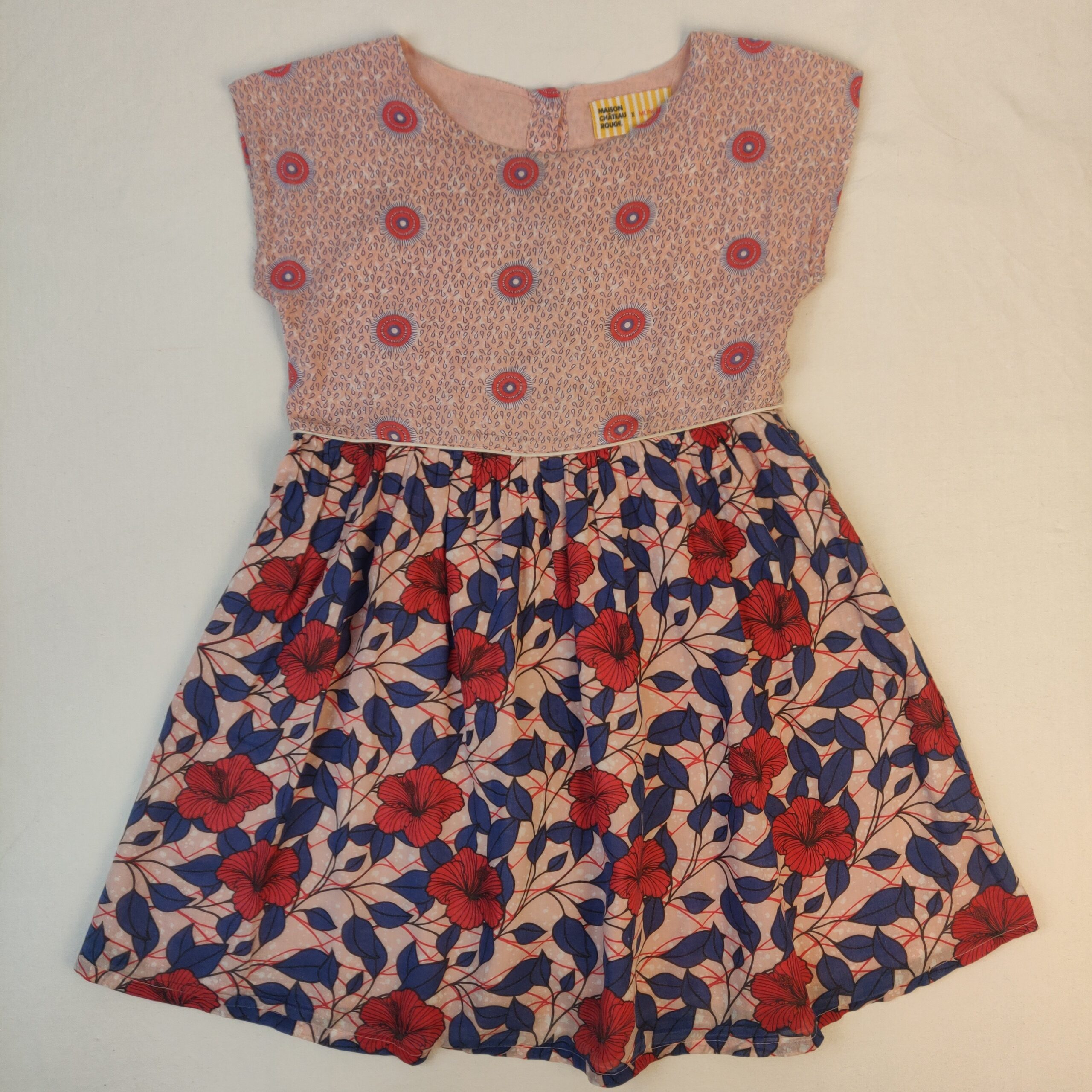 - Robe Monoprix x Château rouge doublée à l’intérieur. La robe a des motifs colorés sur la moitié haute est des motifs de fleurs bleu et rouge sur la robe. La doublure est de couleur rose. Ouverture sur la nuque vie des boutons classiques.