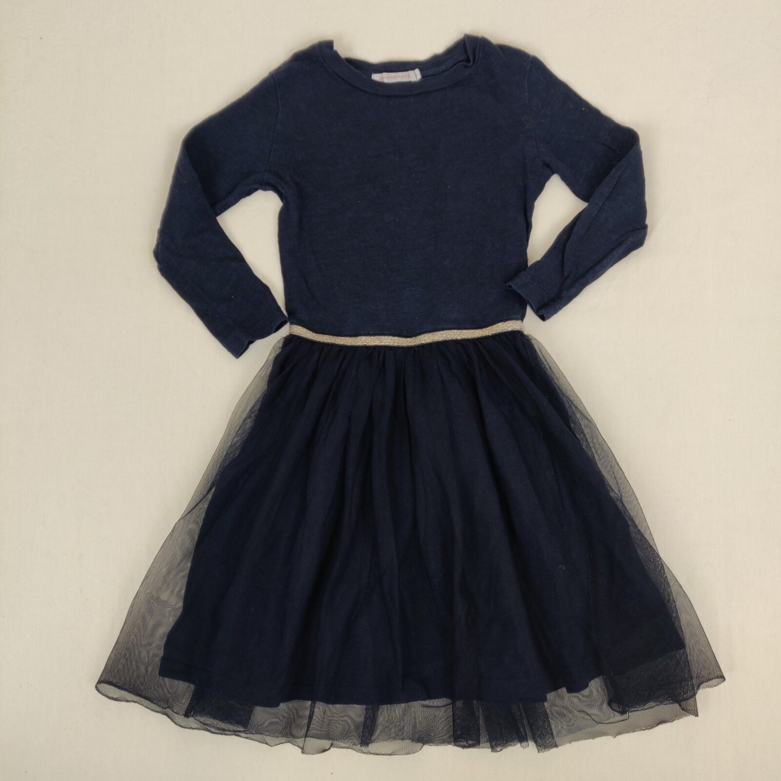 Autres commentaires : Robe longue bleu marine. Haut manches longues en jersey, bas en tulle 100% polyester et doublure en coton.Parfaite pour occasion spéciale (noel).