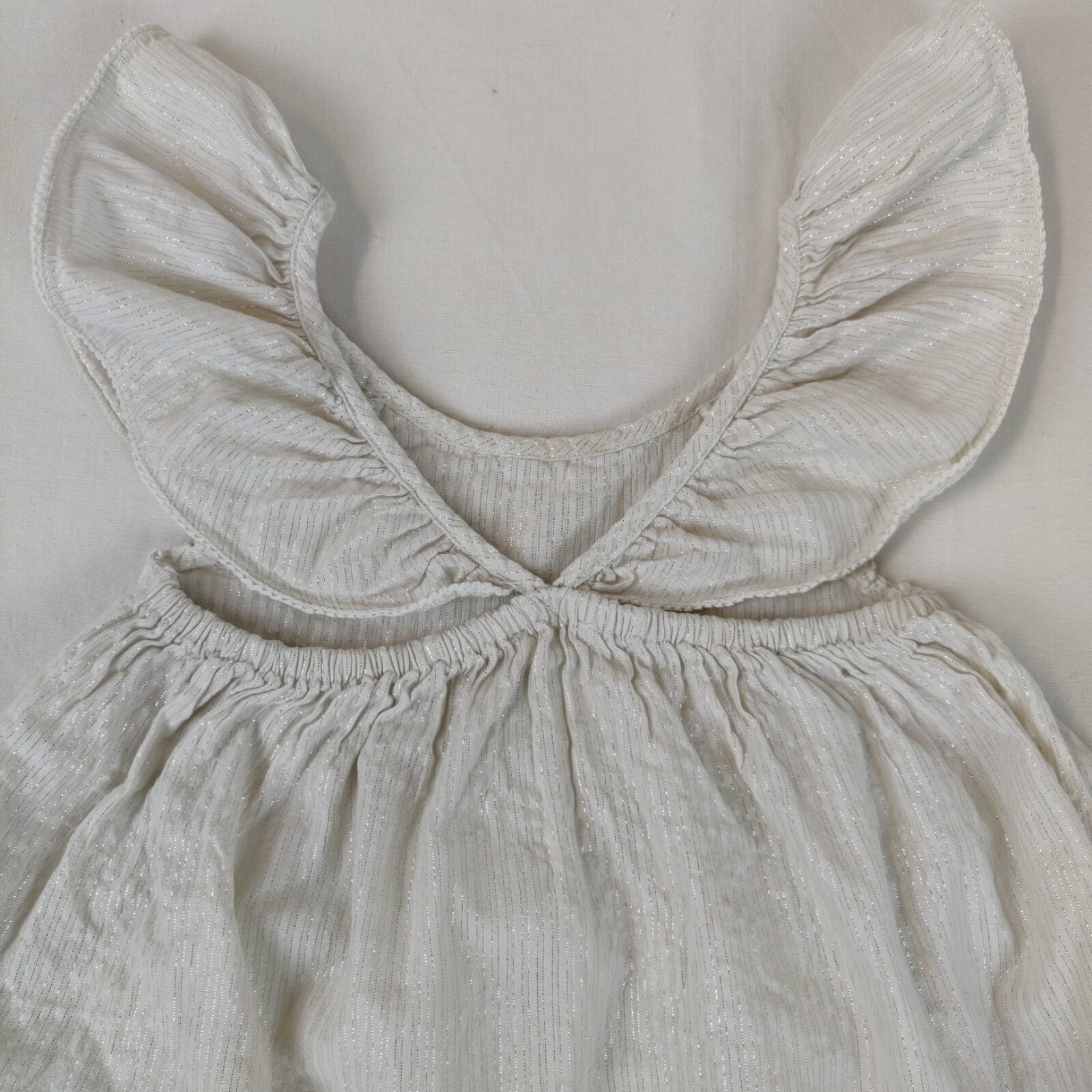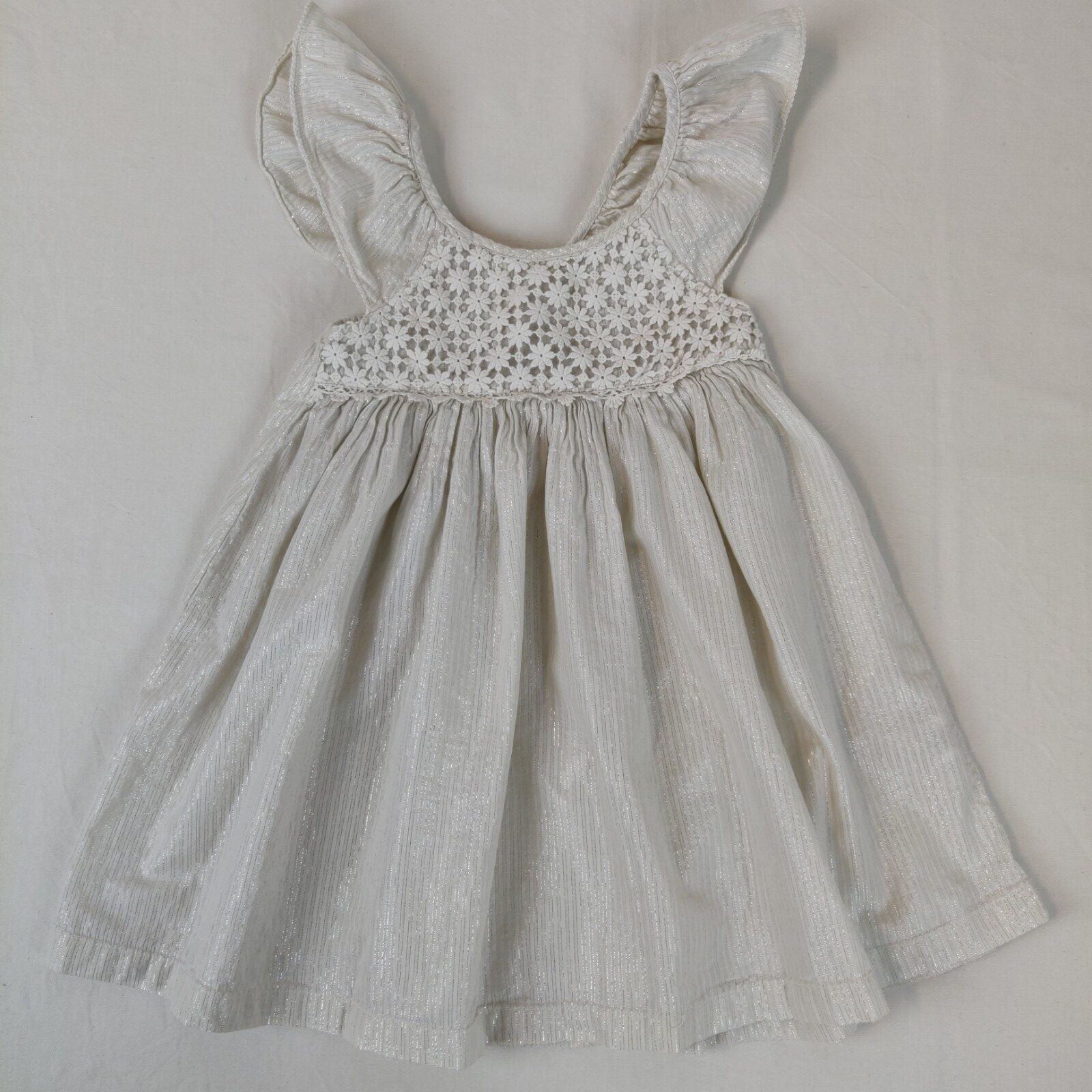 Autres commentaires : Robe à manches courtes blanche à fines rayures argentées. Partie centrale à motifs floraux en broderie anglaise. Une micro tâche orange dans haut et une tâche orange presque imperceptible dans le bas.