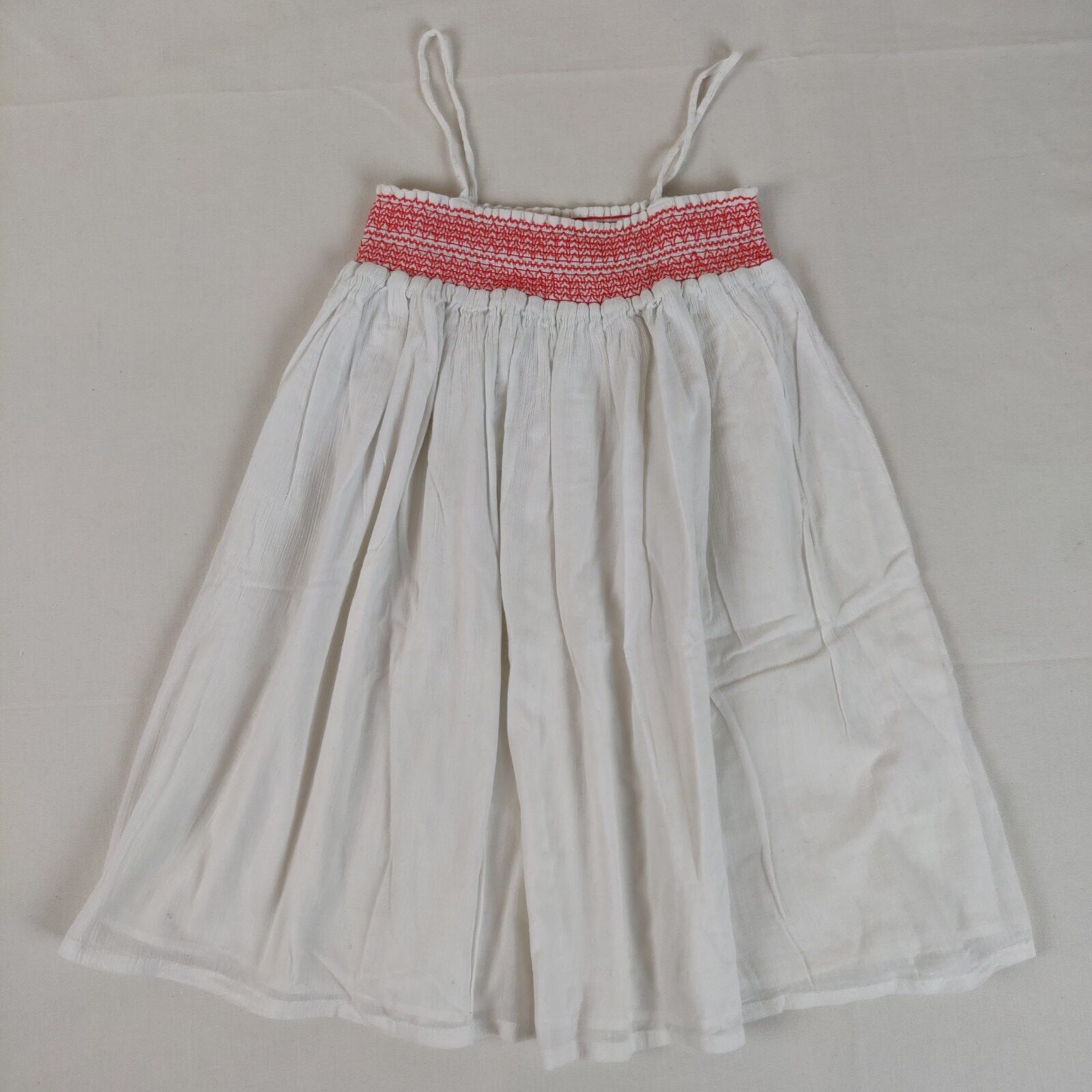 Autres commentaires : Robe doublée à fines bretelles smockée – blanc. Partie smockée à motifs géométriques rouge orangé.