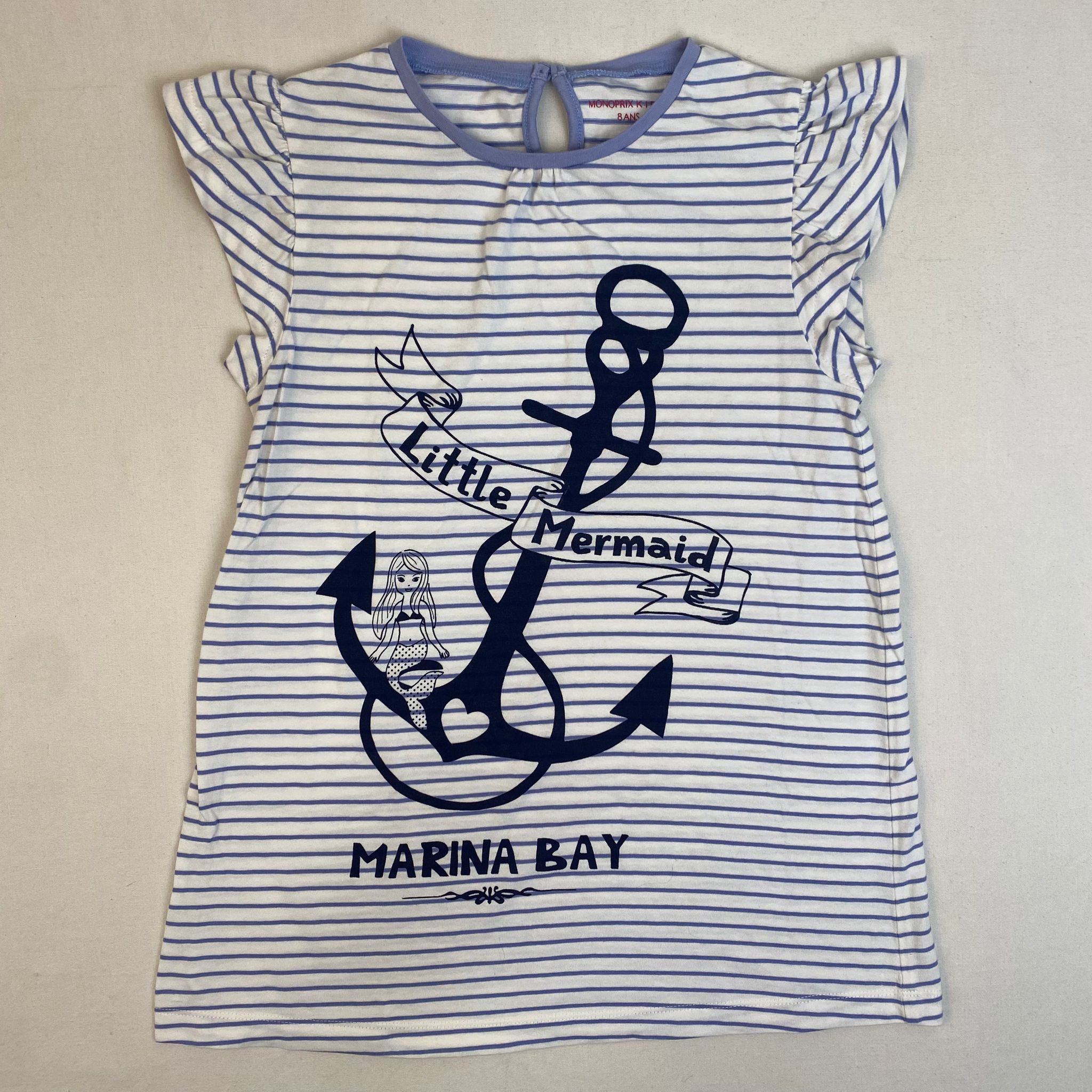 Robe courte à rayures bleu clair, col rond, fermeture par bouton classique au dos, motif sirène à l’ancre et inscription « Little Mermaid. Marina bay »en bleu foncé.