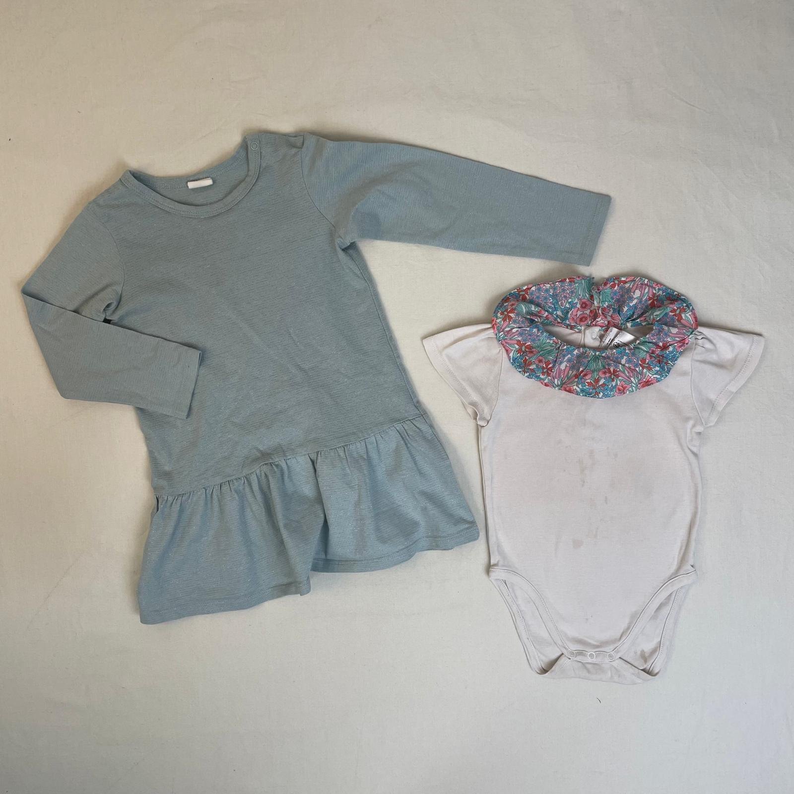 - Robe fine à manches longues, vert d’eau avec de fines rayures en fibres métalliques dorées, col rond, taille basse, fermeture à l’épaule gauche par bouton pression. OFFERT : Body blanc Jacadi avec col collerette imprimé Liberty coloré (petites taches devant).