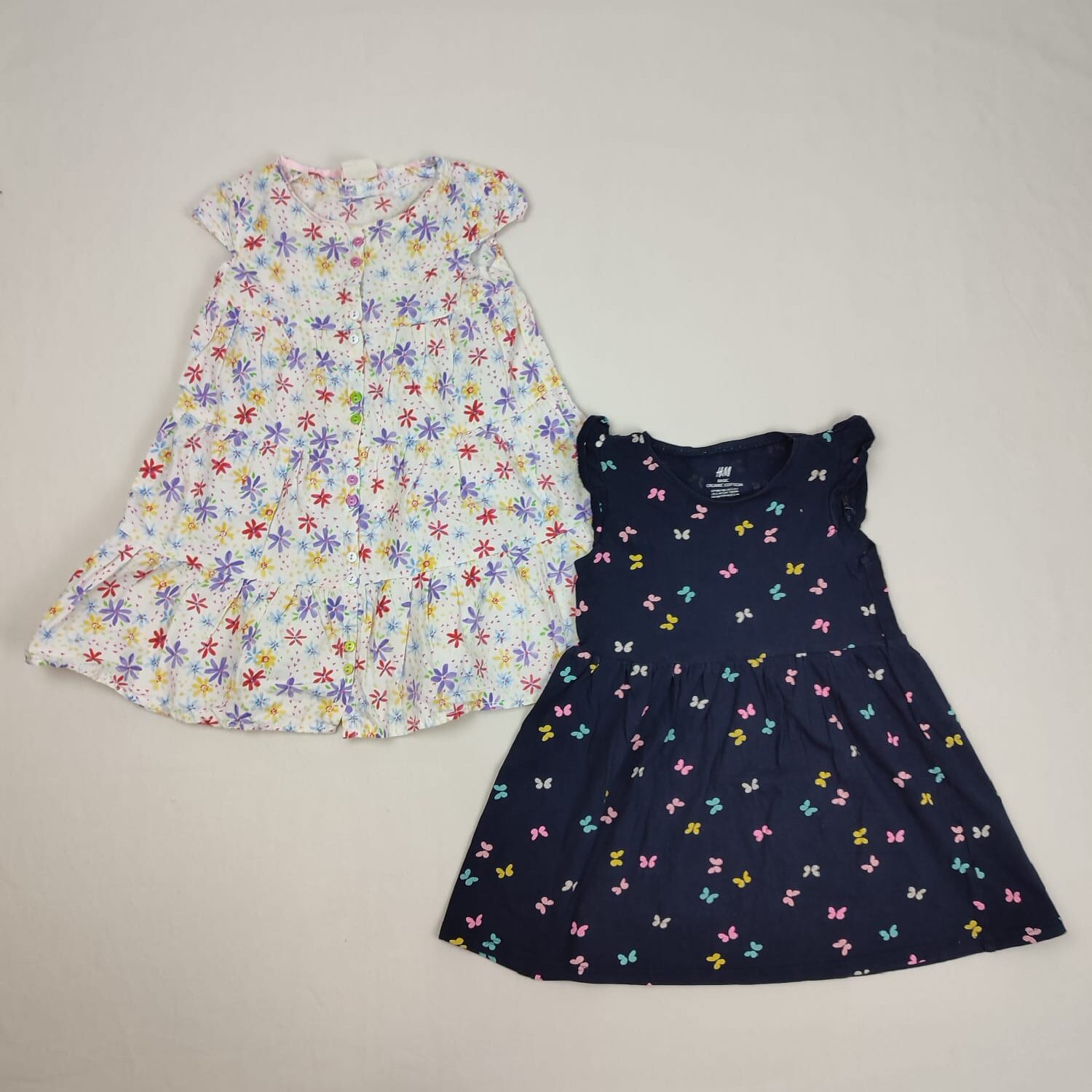 Autres commentaires : Lot de 2 robes d’été, dont une évaséee bleu marine H&M en jersey de coton biologique, col rond, manches très courtes volantées, motifs petits papillons roses, jaunes, bleus et blancs et une robe Kidkind, évasée et volantée en bas, blanche à fleurs multicolores, à manches très courtes style légèrement ballon, fermeture par petits boutons blancs, verts et roses.