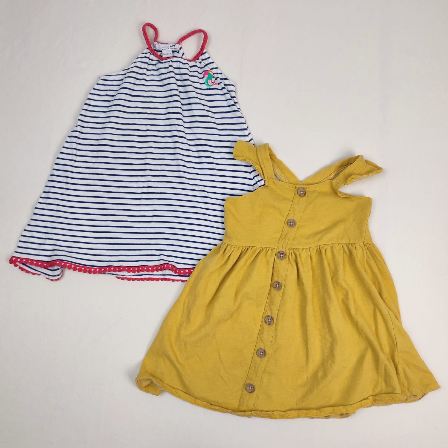 Autres commentaires : Lot de 2 robes : Robe La Halle blanche à rayures bleu foncé et à bretelles roses, liseré de dentelle rose en bas, motif petit perroquet au niveau de la poitrine, 100% coton. – Robe Kiabi jaune moutarde à bretelles volantées, taille élastiquée.