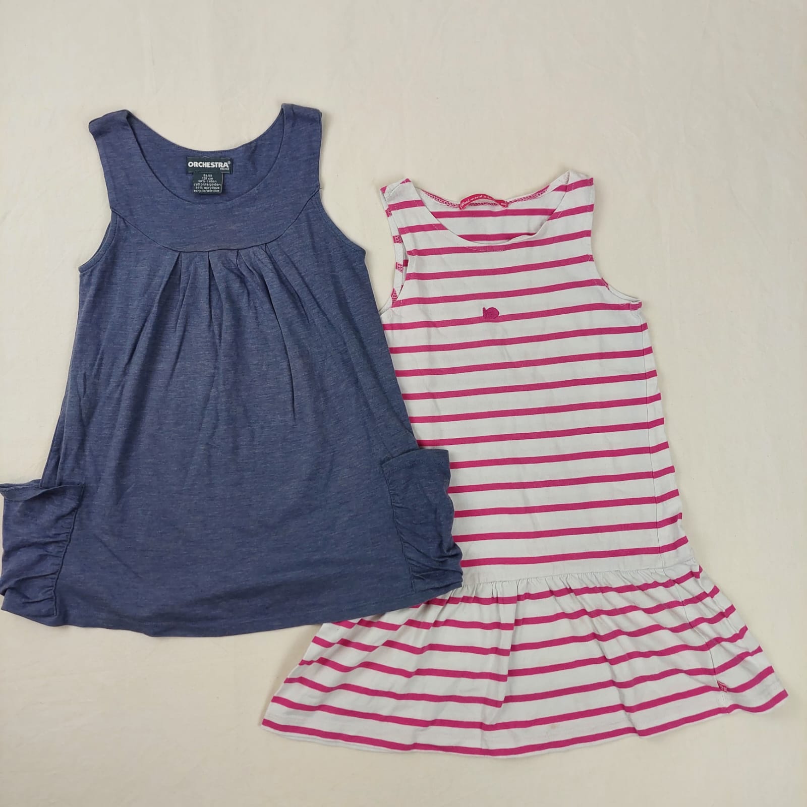 Autres commentaires : Lot 2 robes, une bleu 50% acrylique, avec poche sur les côtés, une blanche rayée rose, taché a l’avant en bas et a l’arrière