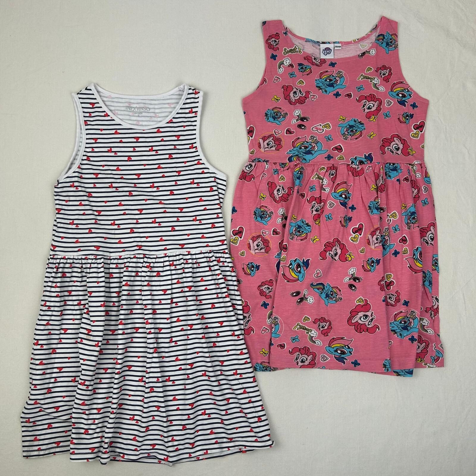 Autres commentaires : Lot de 2 robes sans manches : – une In Extenso blanche avec rayures bleu marine et motifs coeur rouge – une My little pony rose avec dessin my little pony.