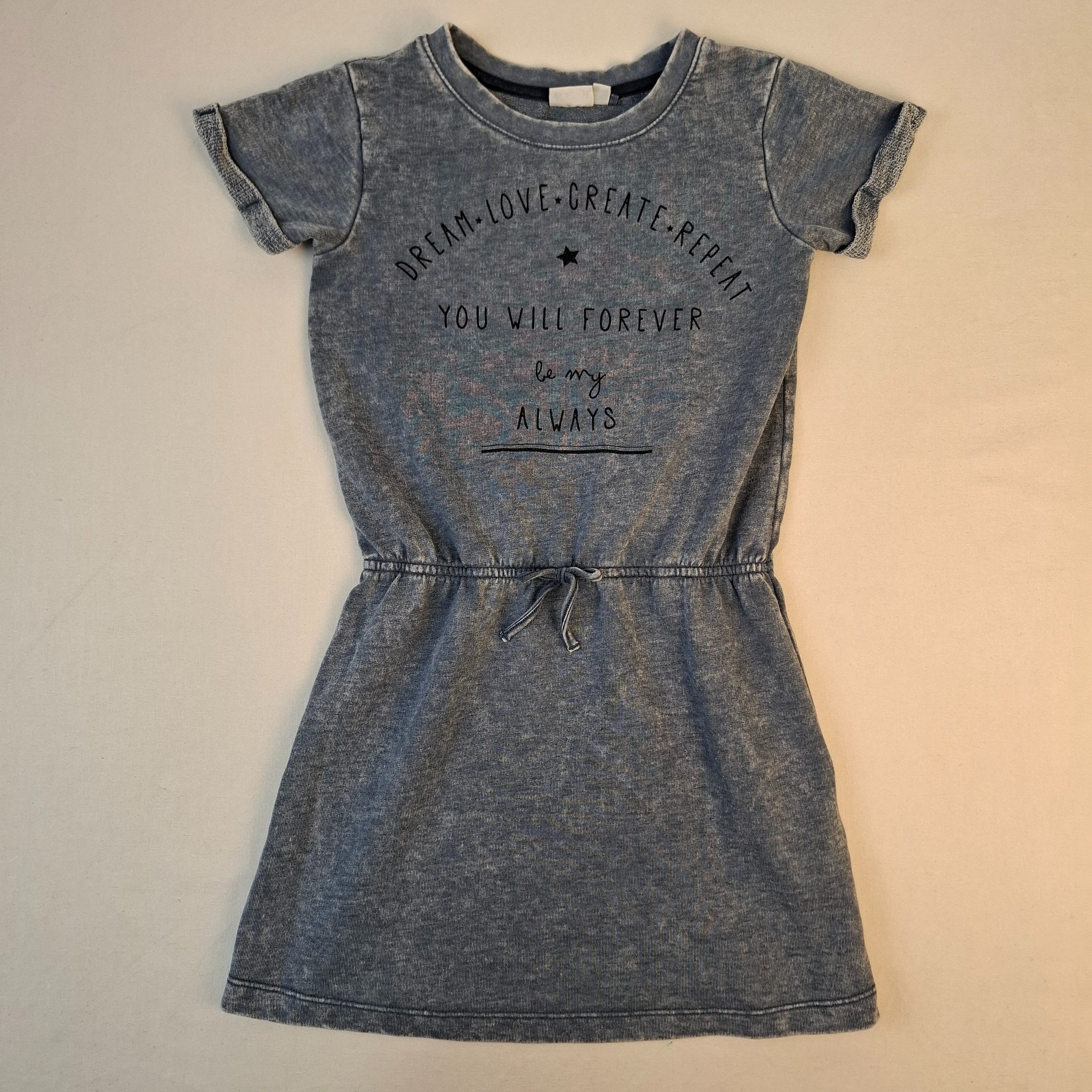 - Robe bleue à manches courtes, style délavé, taille élastiquée. .