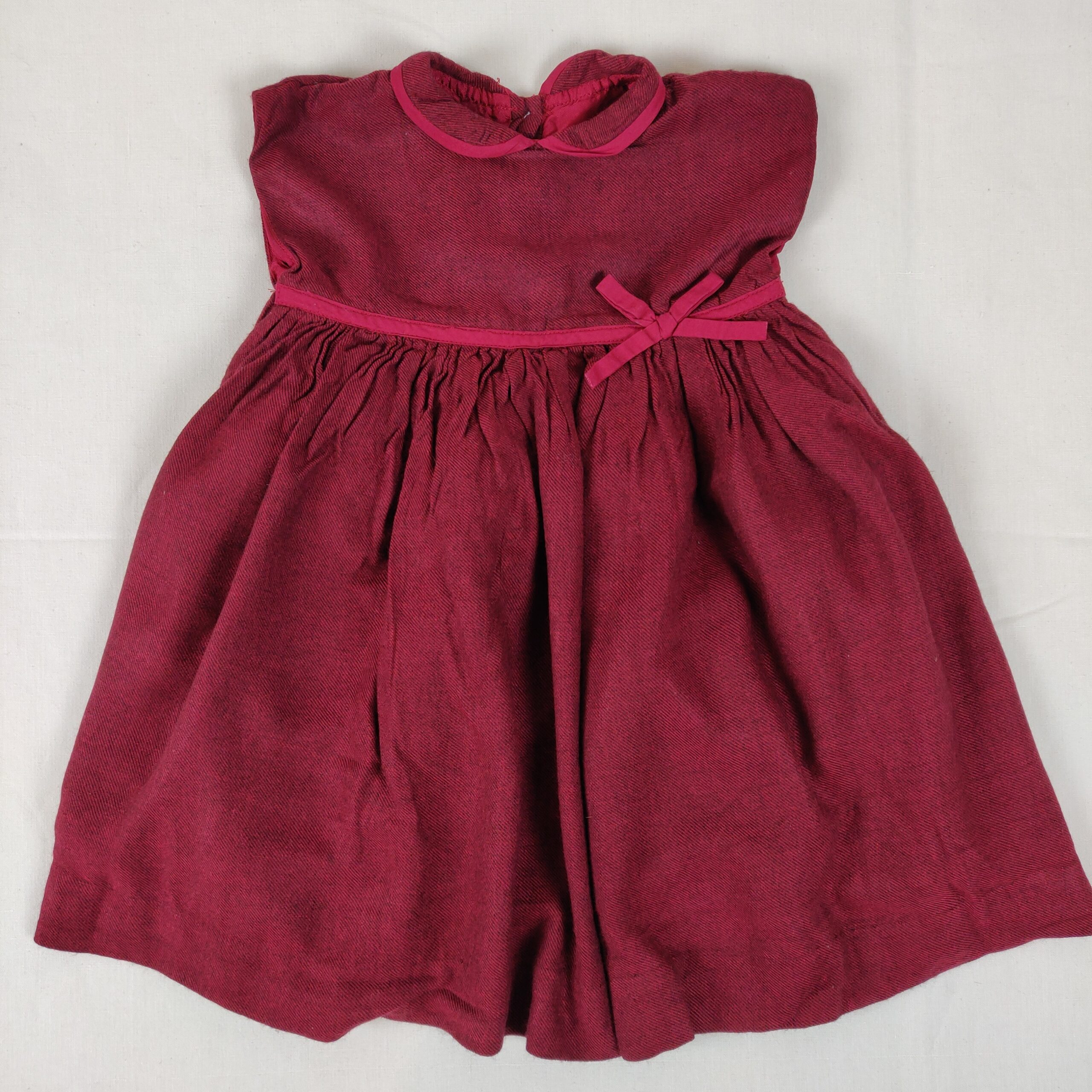 Autres commentaires : Robe bordeaux à manches courtes, col claudine, taille haute avec petit noeud en satin.