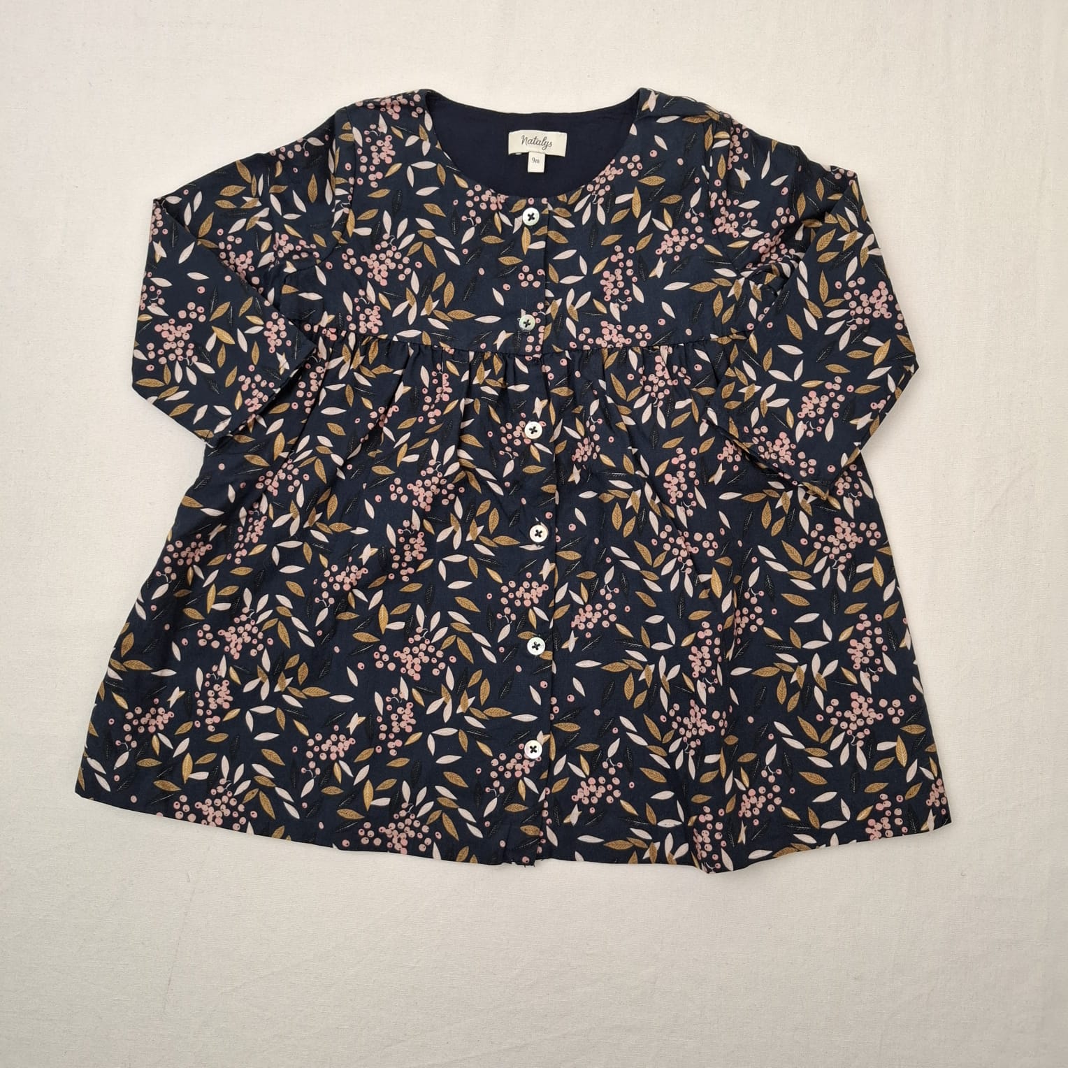 Autres commentaires : Robe blue foncé à manches longues, motif feuilles, col rond, fermeture par boutons devant, doublure en viscose.