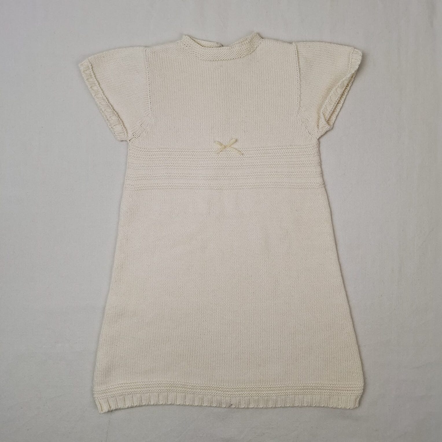 Autres commentaires : Robe en maille ecru à manches courtes, fermeture par boutons au dos, col rond.