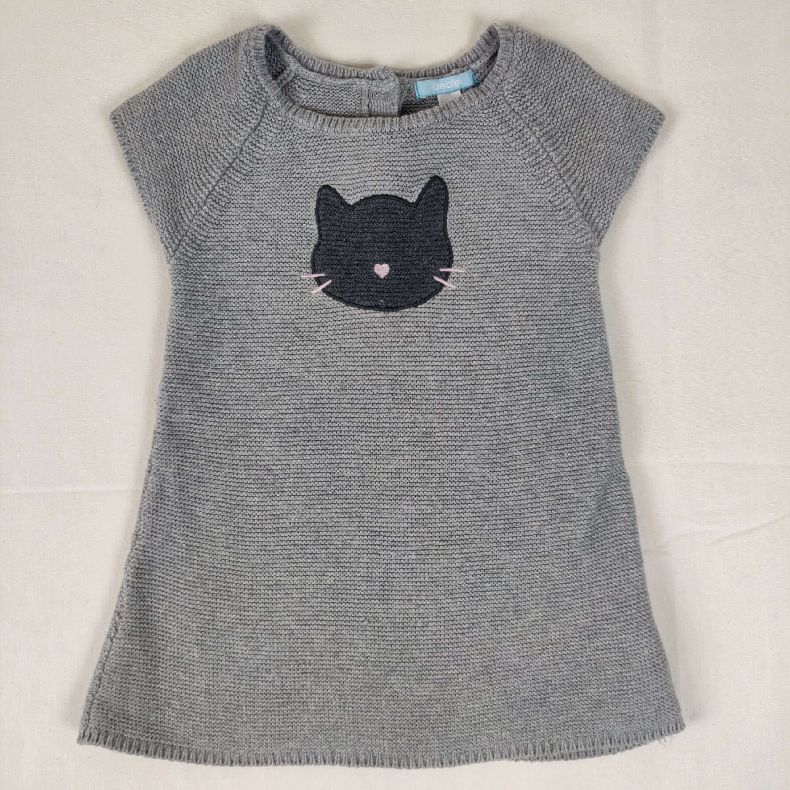 Autres commentaires : 30% polyamide, 10% laine. Robe manches courtes en maille grise, col rond, tête de chat gris foncé à moustaches et nez en forme de coeur rose. Fermeture au dos par 3 boutons.
