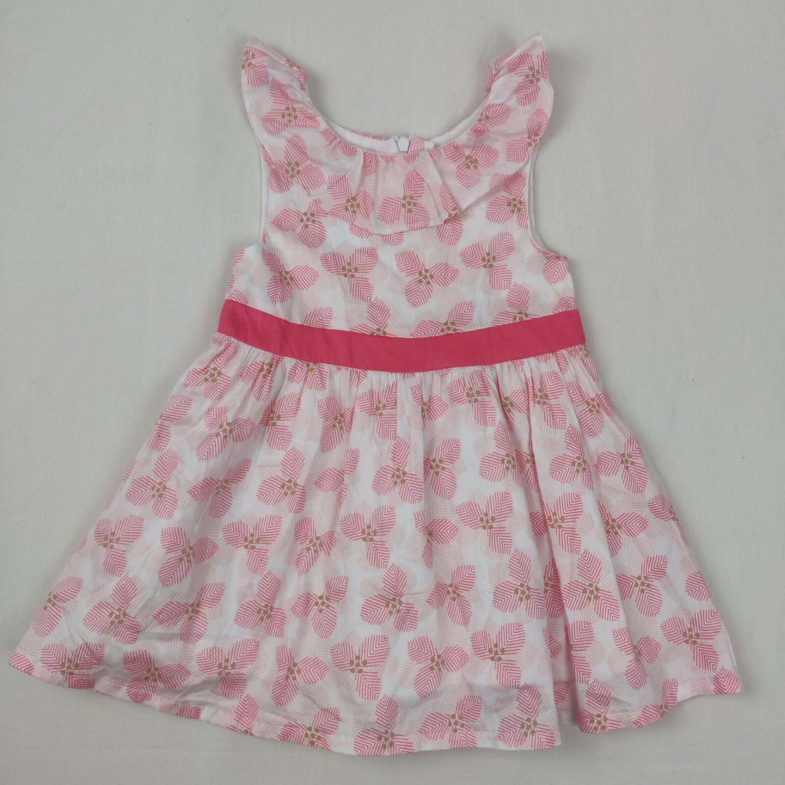 Autres commentaires : Robe rose sans manches fleurie avec du rose plus doncé, col collerette et une fermeture au dos en zip.