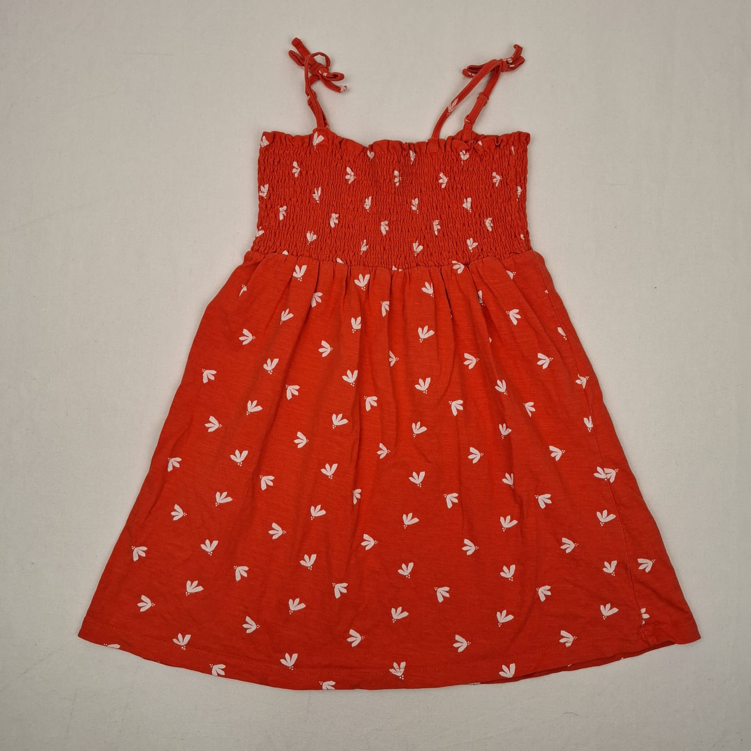 Autres commentaires : Robe à smocks et à fines bretelles réglables, de couleur orange sanguine parsemée de motifs végétaux blancs.