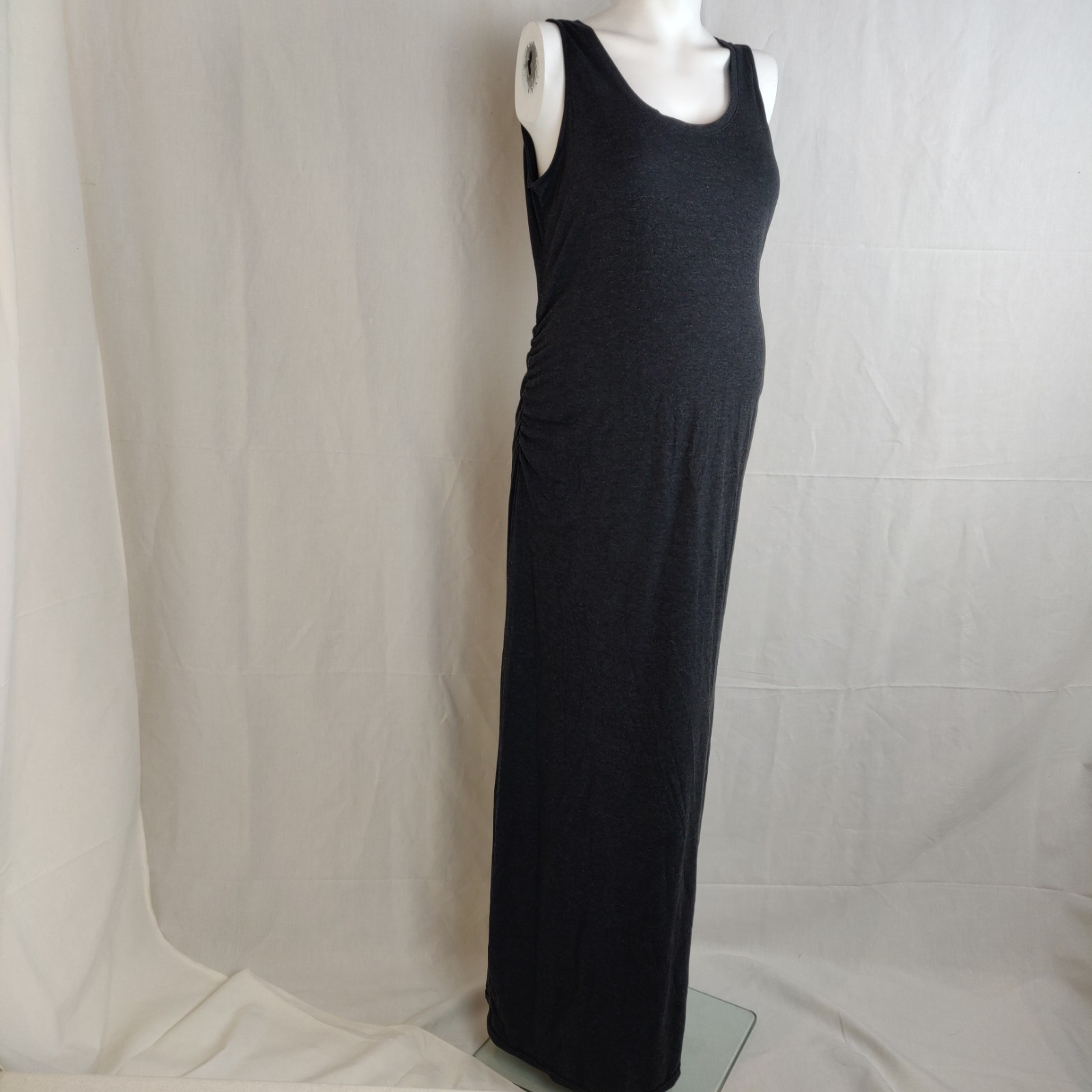 Autres commentaires : 34% rayon, 4% spandex. Robe longue jusqu’aux chevilles, gris anthracite, haut à bretelles format débardeur, descend jusqu’aux chevilles, fendue sur la jambe gauche à partir du genou. Fronces sur les côtés pour mettre en valeur le ventre.