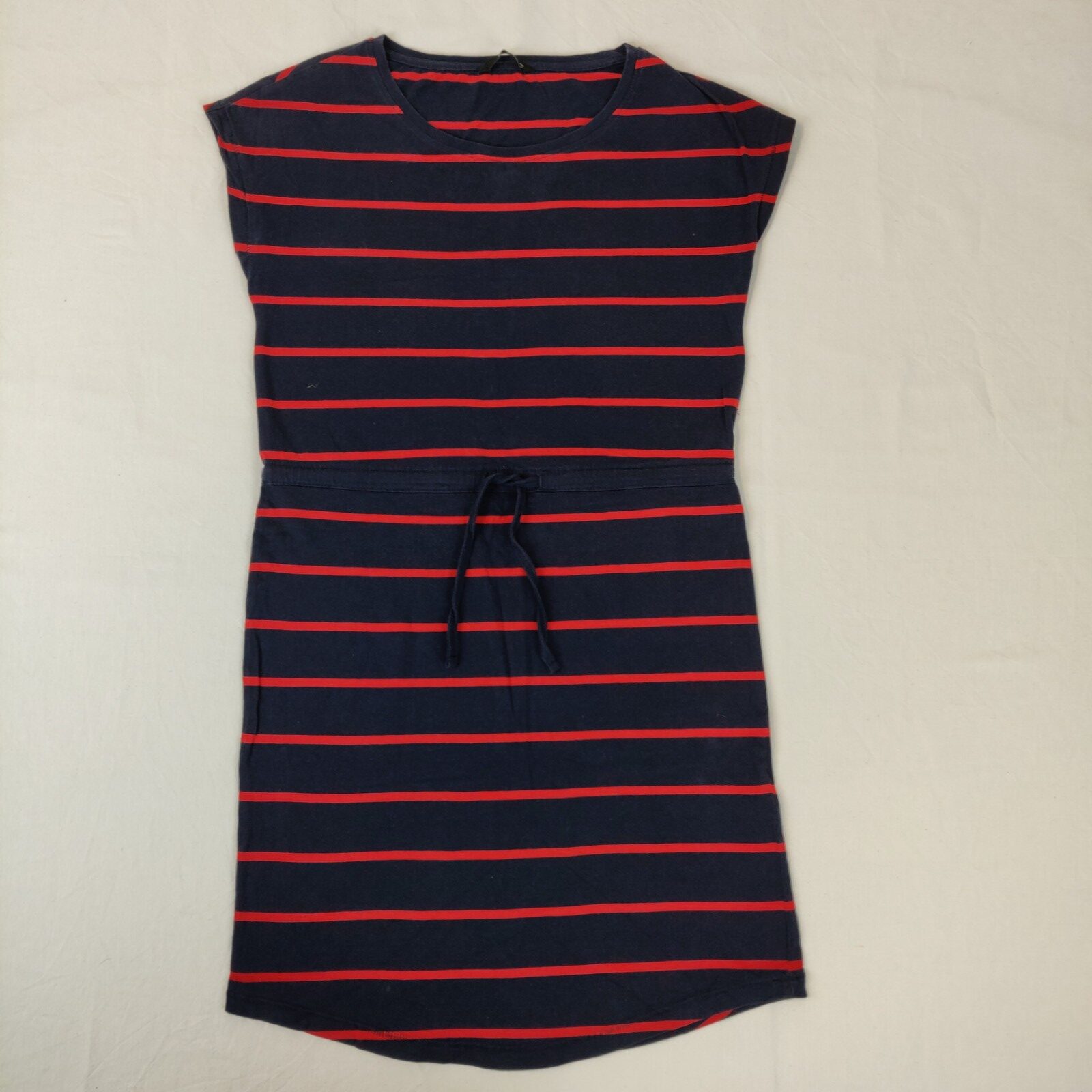 Autres commentaires : Robe à manches courtes bleu marine à rayures rouges (taille XS). Taille marquée et élastique avec cordon interne bleu marine.
