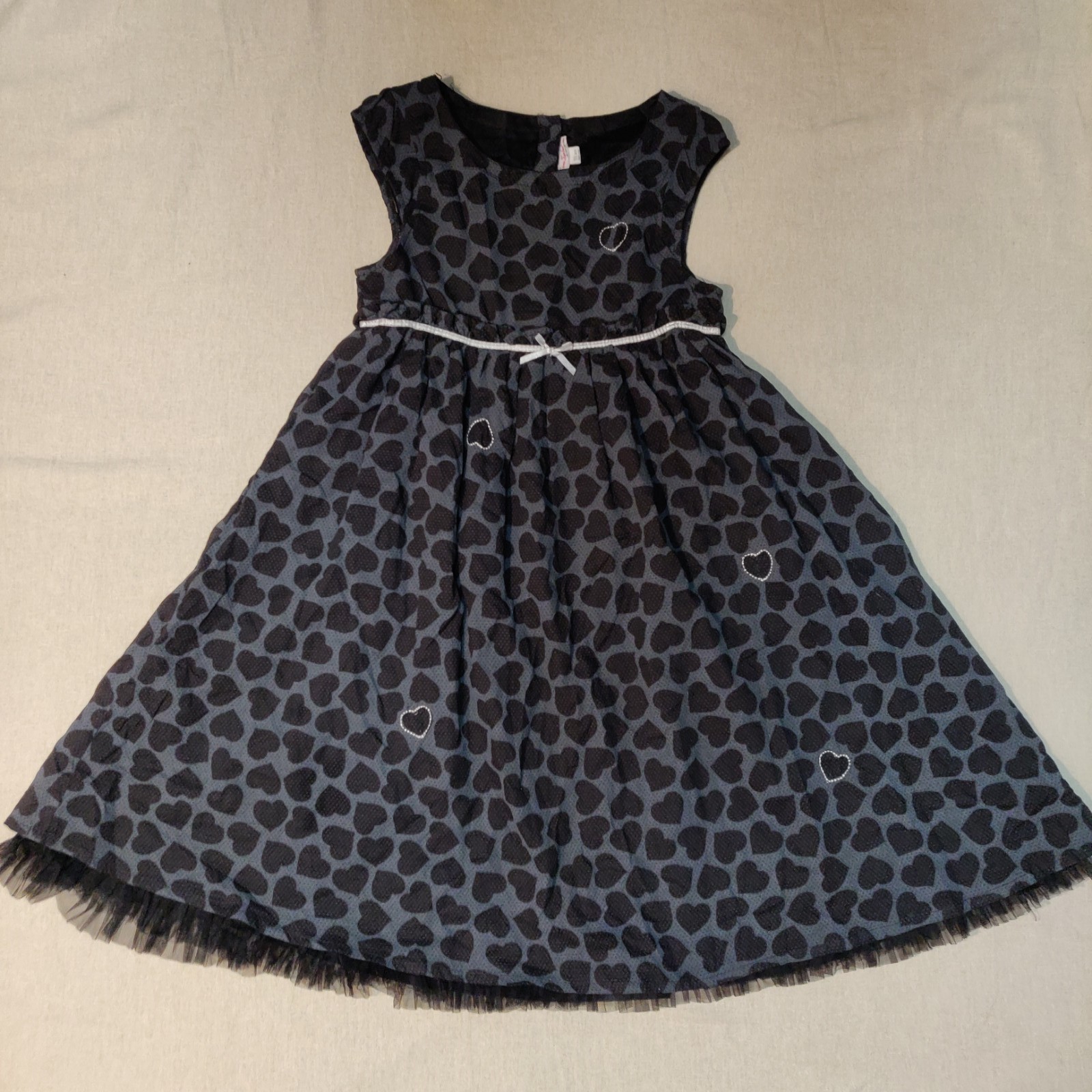 Autres commentaires : Robe occasion spéciale à manches courtes, bleu gris à coeurs noirs, avec ceinture argentée. fermeture au dos par 4 boutons argentés. Doublure en nylon noire, petit volant de tulle au bas. Fluide et légère, très jolie.