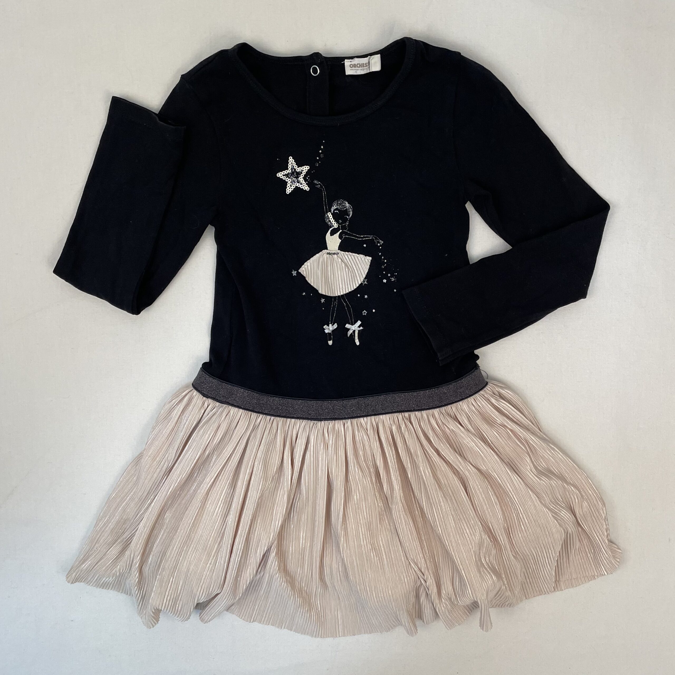 - Manches longues, haut noir, col rond, fermeture par boutons pression au dos, double jupe beige, taille élastique, motif ballerine devant.