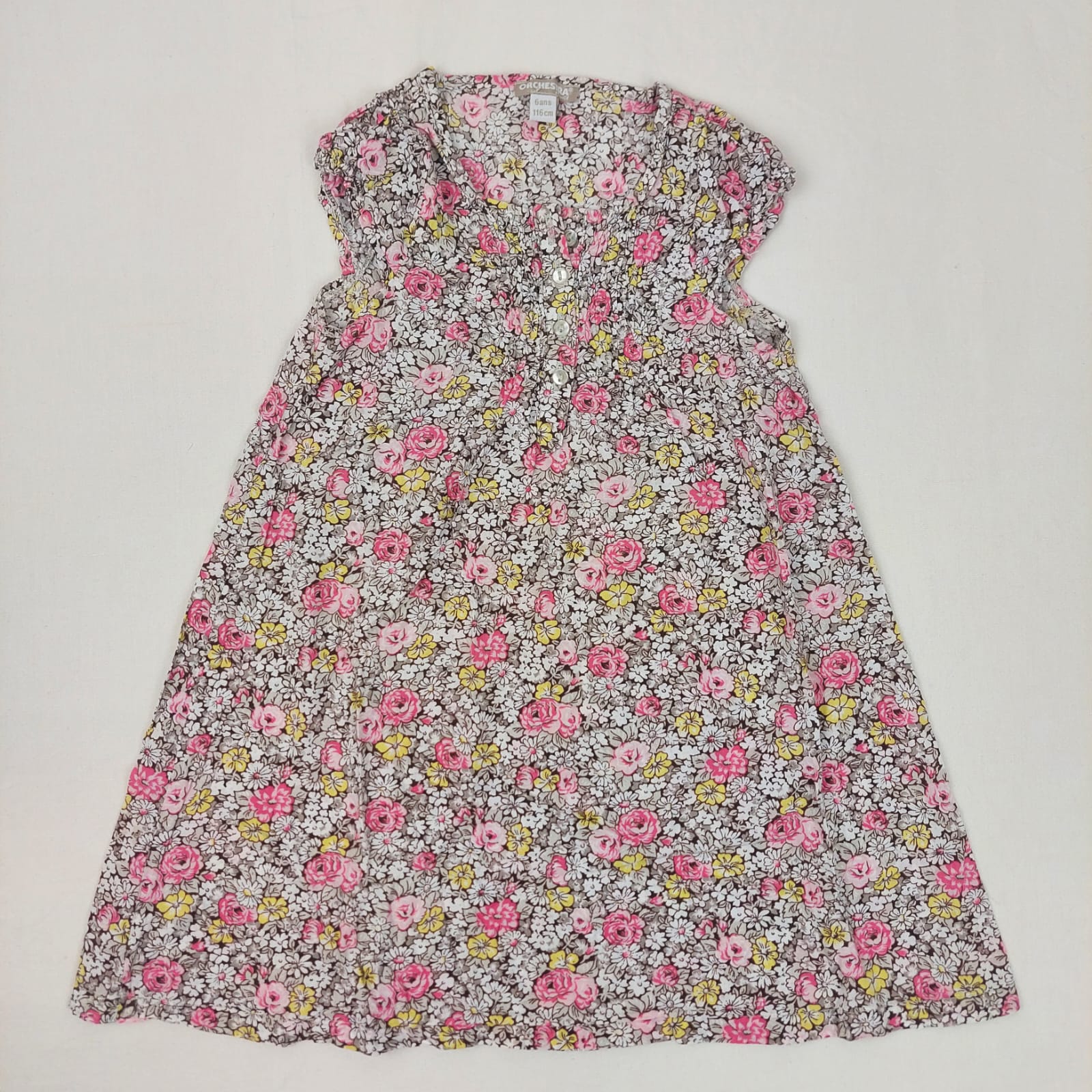 Autres commentaires : Robe sans manches fleuri rose, jaune et gris, col boutoné à l’avant
