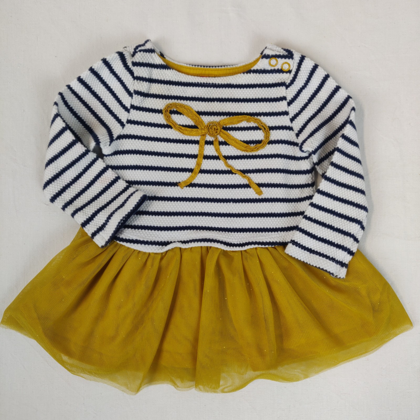 Autres commentaires : 4% élasthanne. Robe à manches longues en 2 parties distinctes. Partie supérieure blanche rayée bleu marine à motif central piqué noeud jaune pailleté doré. Ouverture latérale à 2 pressions. La jupe doublée est en tulle jaune ocre pailleté doré.