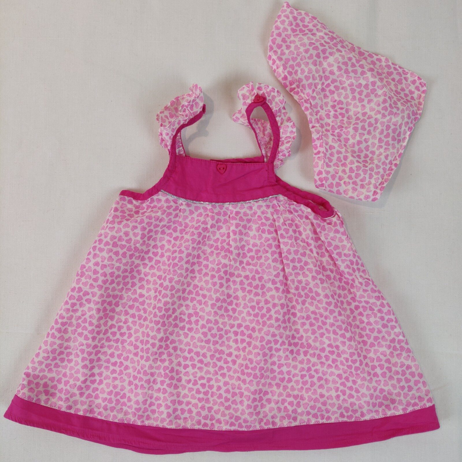Autres commentaires : Robe à fines bretelles rose fuschia ornées d’un tissu froncé blanc à coeurs roses – blanc à motifs coeurs roses. Tissu rose fuschia central avec un liseré argenté Un fichu assorti avec élastique.