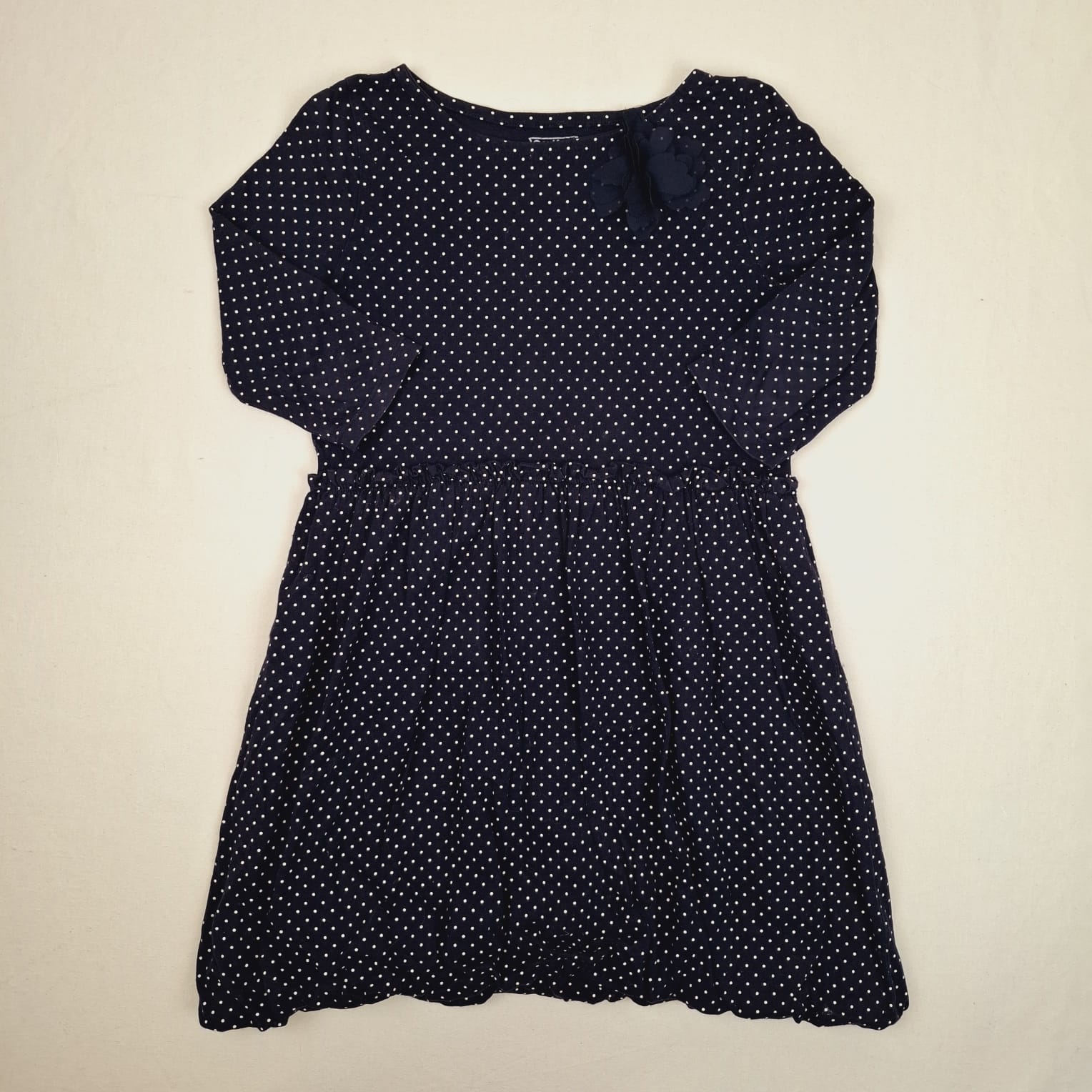Autres commentaires : Robe bleu marine à pois blancs à manches 3/4, col rond, taille élastiquée cintrée plissée, bas style boule, doublure en coton, broche fleur en tissu sur le devant.