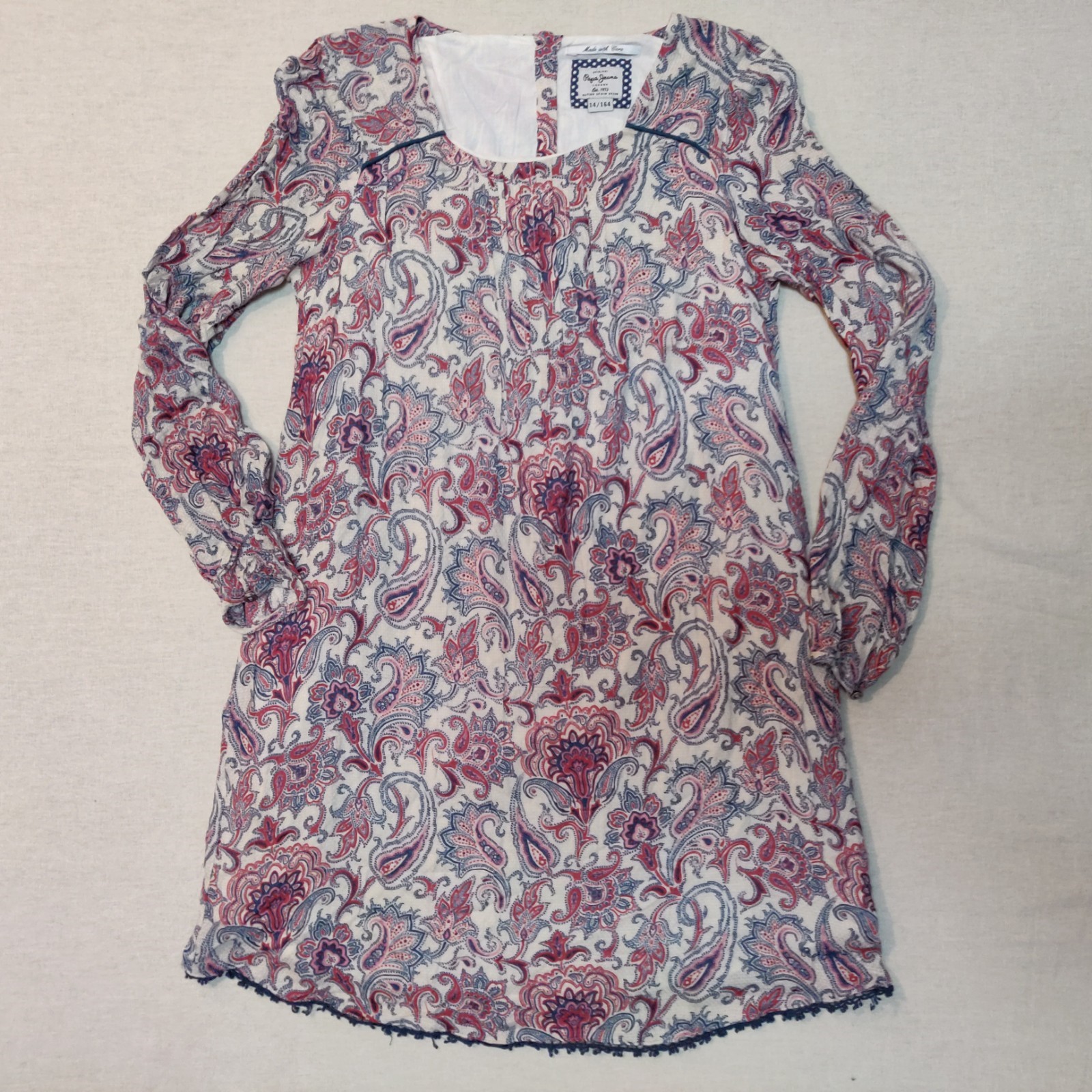 Autres commentaires : Robe manches longues, en toile viscose légère et fluide, doublure coton. Motifs pashmina bordeaux, vieux rose et bleu marine. Base de la robe en dentelle bleu marine. Fermeture par 4 boutons au cou, et boutons aux poignets. Quelques fils tirés, noveau réduit de Kiwi à Fraise.