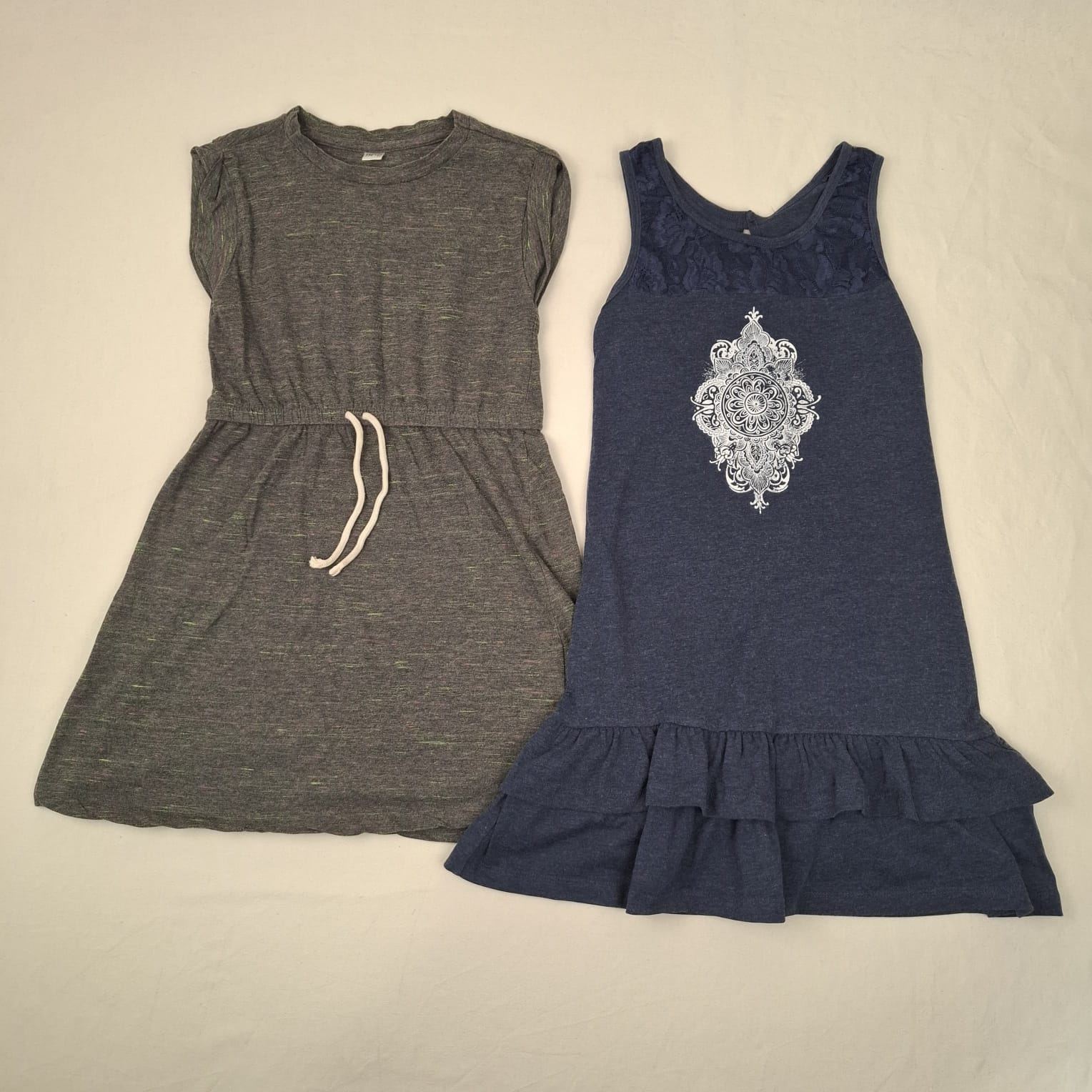 Autres commentaires : Lot de 2 robes sans manches: – Une bleue foncé Pepperts avec insert ajouré en haut devant, fermeture par un bouton au dos, 4% élasthanne. – Une grise foncé sans marque, ceinture élastique avec cordon, 40% polyester.