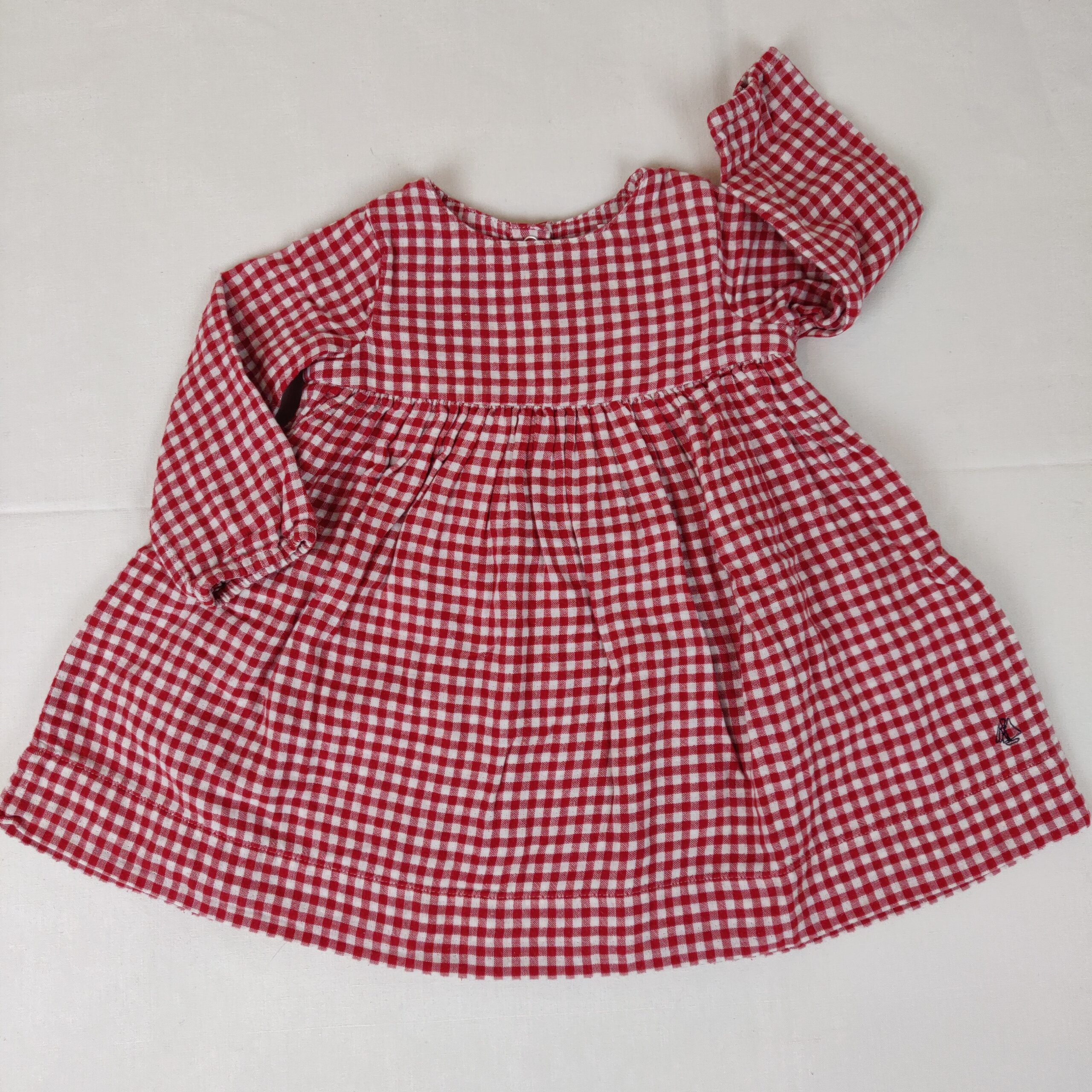 Autres commentaires : Robe à manches longues à carreaux rouges et blancs, fermeture par boutons pression le long du dos. Blanc un peu passé