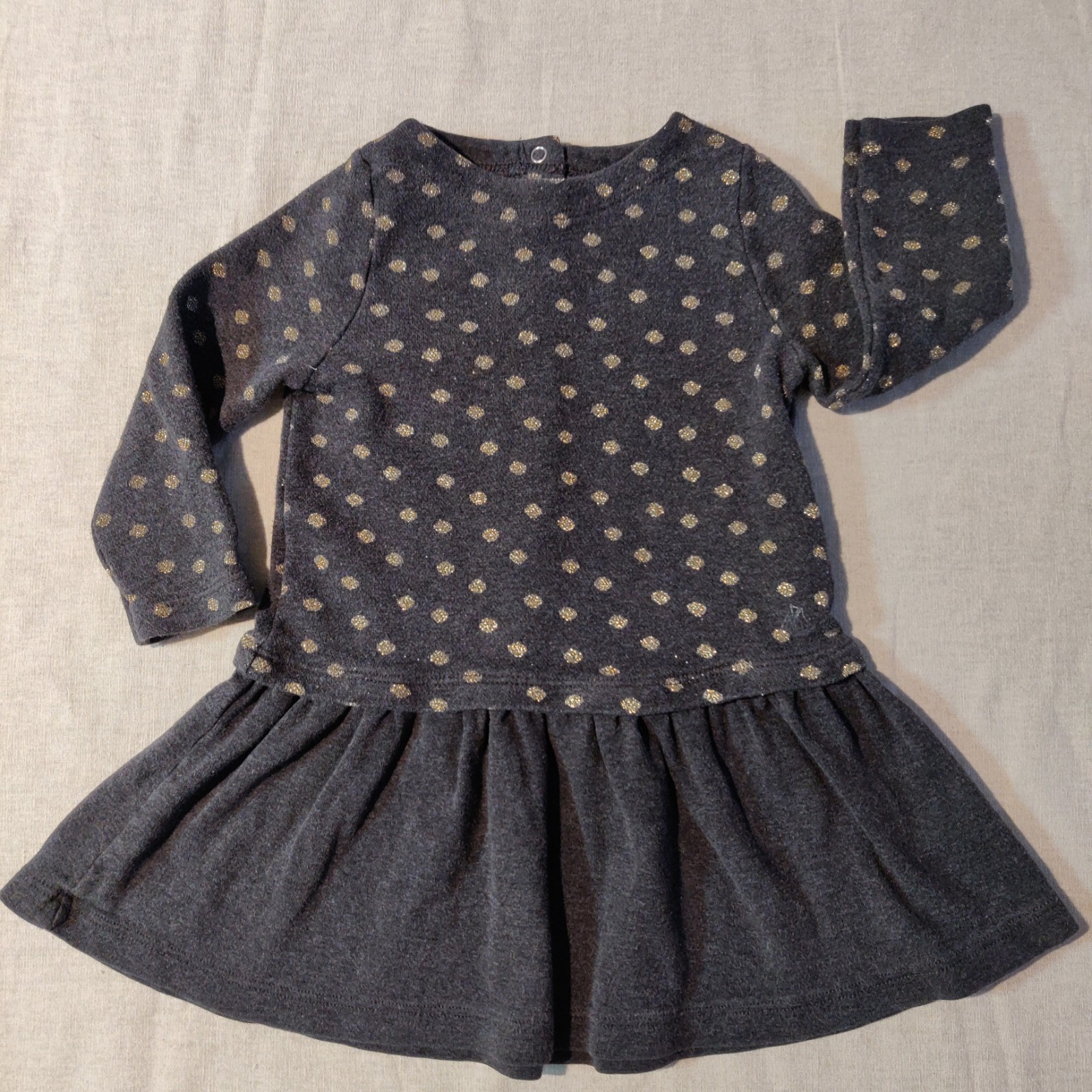 Autres commentaires : 10% polyester, 10% polyamide. robe gris foncé à pois dorés, jupe à volants grise unie. Fermeture par boutons pression au dos.