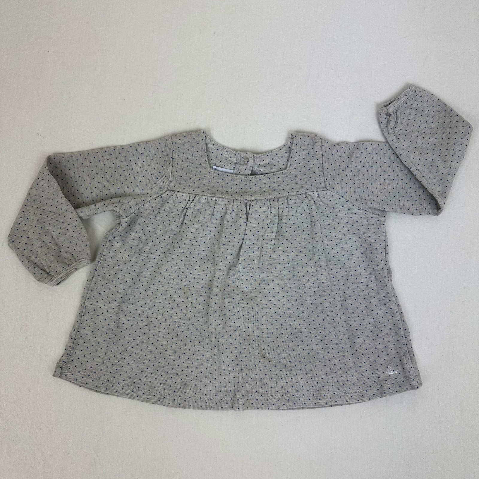 Autres commentaires : Robe manches longues gris, col carré, avec des pointillés et une fermeture au dos par boutons pressions. Petit défaut: petites tâches marron. Niveau reduit de Kiwi à Fraise.