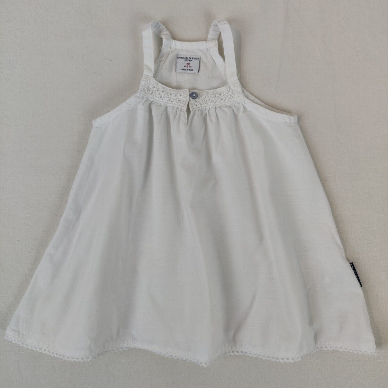 Autres commentaires : Robe à fines bretelles – blanc. Partie supériere en crochet blanc. Ouverture centrale à un bouton. Bas de la jupe décoré en crochet également.