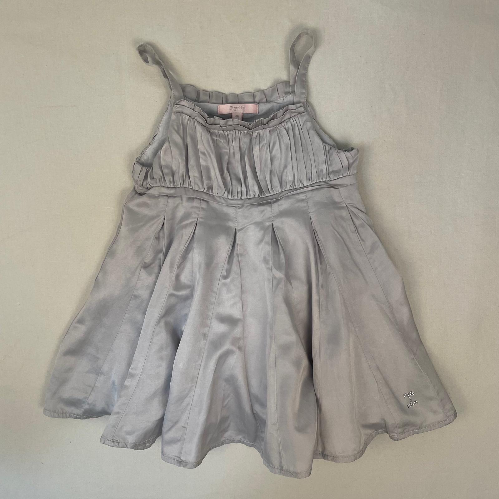- Robe à bretelles gris clair, aspect satiné, taille haute avec bustier plissé, doublure blanche, fermeture latérale par zip.