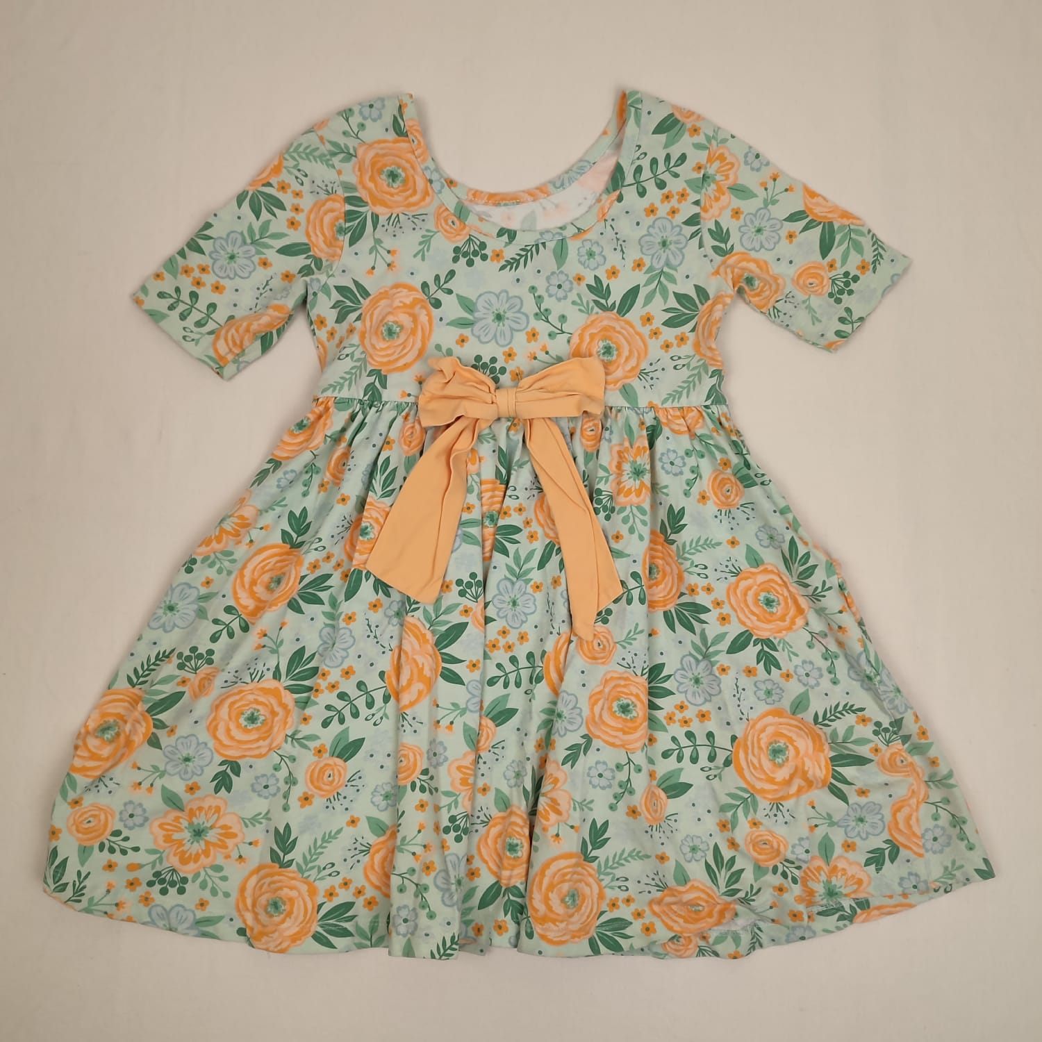 Autres commentaires : 5% spandex. Robe manches courtes vert d’eau, motif de fleurs orange pêche, encolure large arrondie, grand noeud orange pêche à l’arrière au niveau de la taille.