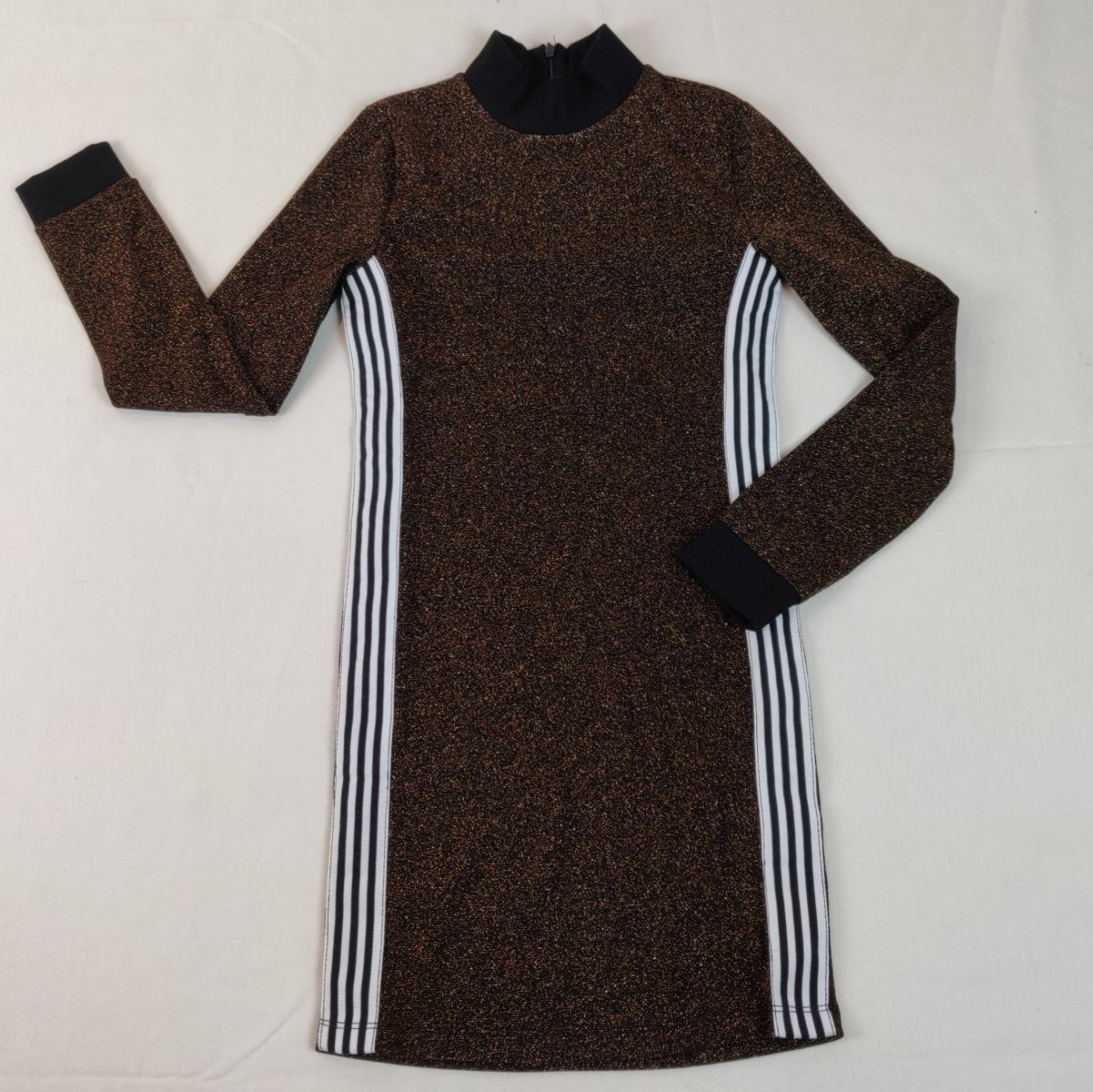 Autres commentaires : Robe sans étiquette (taille estimée 10 ans) près du corps – noire pailletée cuivrée avec des bandes blanches et noires latérales. Col légèrement montant. Ouverture centrale au dos à fermeture éclair.