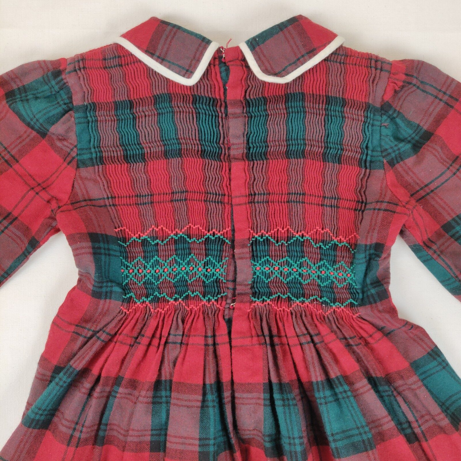 Autres commentaires : Robe à smock à manches longues vintage faite main, probablement en tissu de laine (taille estimée 10 ans) à motif écossais rouge, vert, marron, bordeaux. Broderies centrales géométriques rouges et vertes. Col claudine. Ouverture centrale au dos à agrafes. Ouverture aux poignets à un bouton classique recouvert de tissu rouge assorti. Usure normale du vêtement.