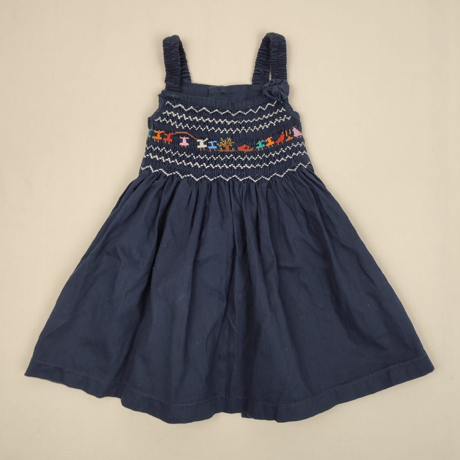 Autres commentaires : Robe bleu foncé à smocks, finement côtélée, à bretelles élastiquées, à l’avant broderies artisanales de Madagascar, fermeture par boutons dans le dos, large ceinture à nouer.