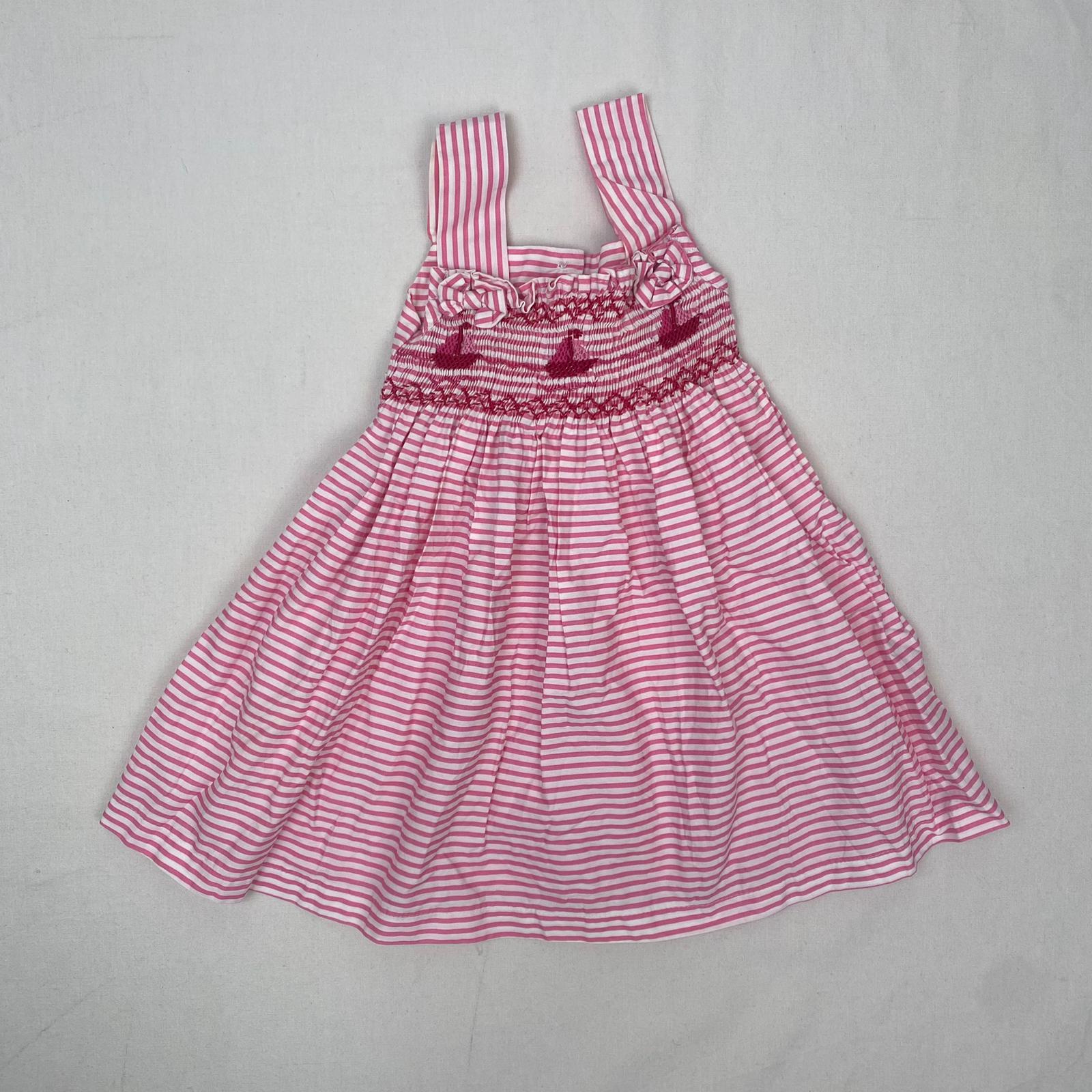 Autres commentaires : Robe bain de soleil à smocks, à rayures roses et blanches, élastiquée au niveau du buste avec des bateaux rouges et roses tressés au niveau des smocks devant, fermeture au dos par petits boutons et par une ceinture à nouer.