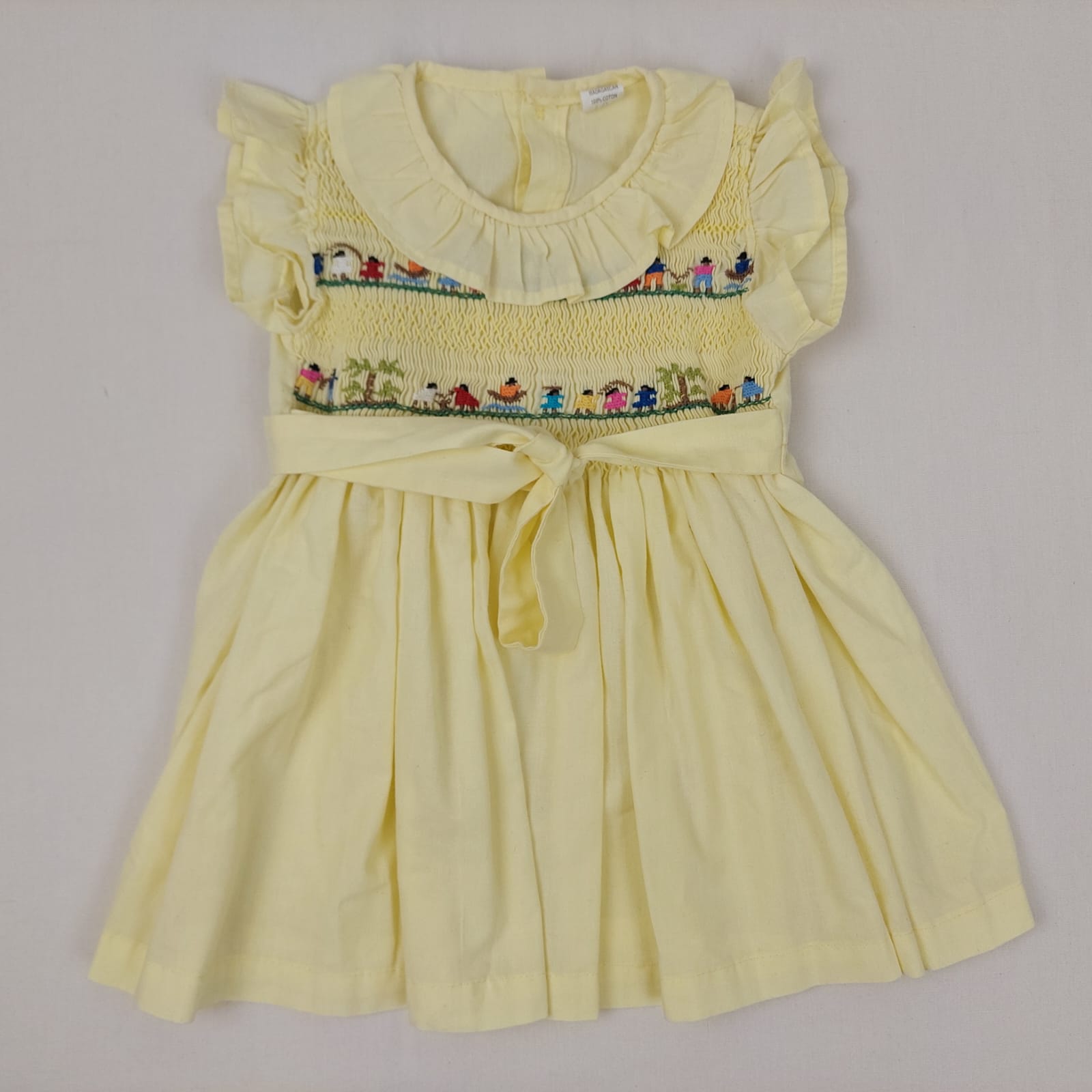 Autres commentaires : Robe jaune brodé à la main , ceinture en tissue à la taillecel et épaule volanté, col boutoné au dos