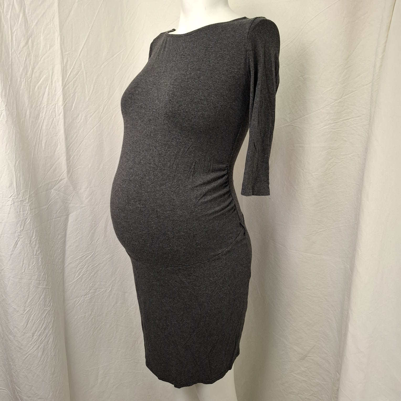 Autres commentaires : Robe gris foncé à manches longues, longue et fluide, élastiquée et froncée en latéral pour mieux épouser la forme du ventre, col large et arrondi devant et au dos. Taille estimée 36.