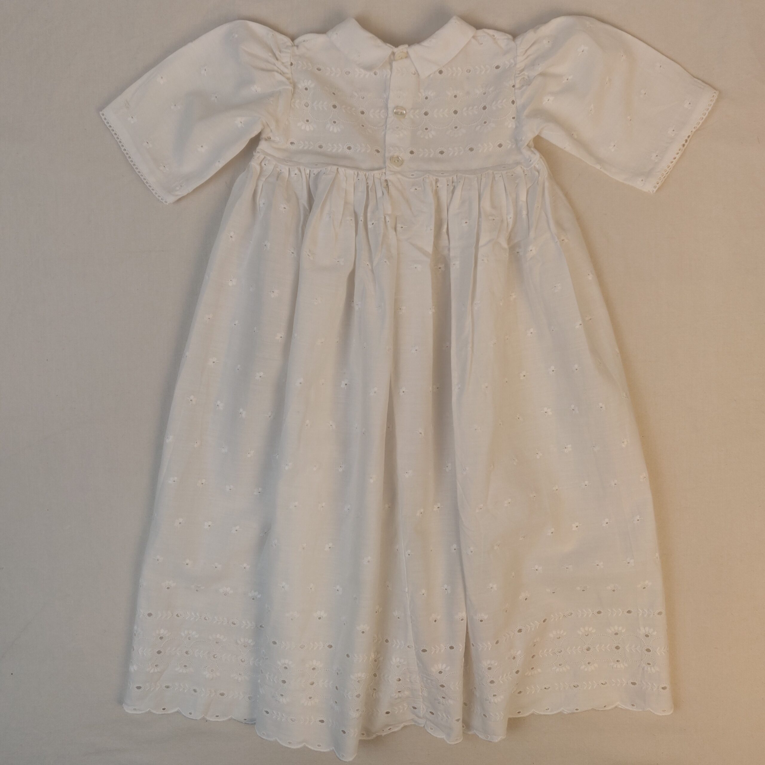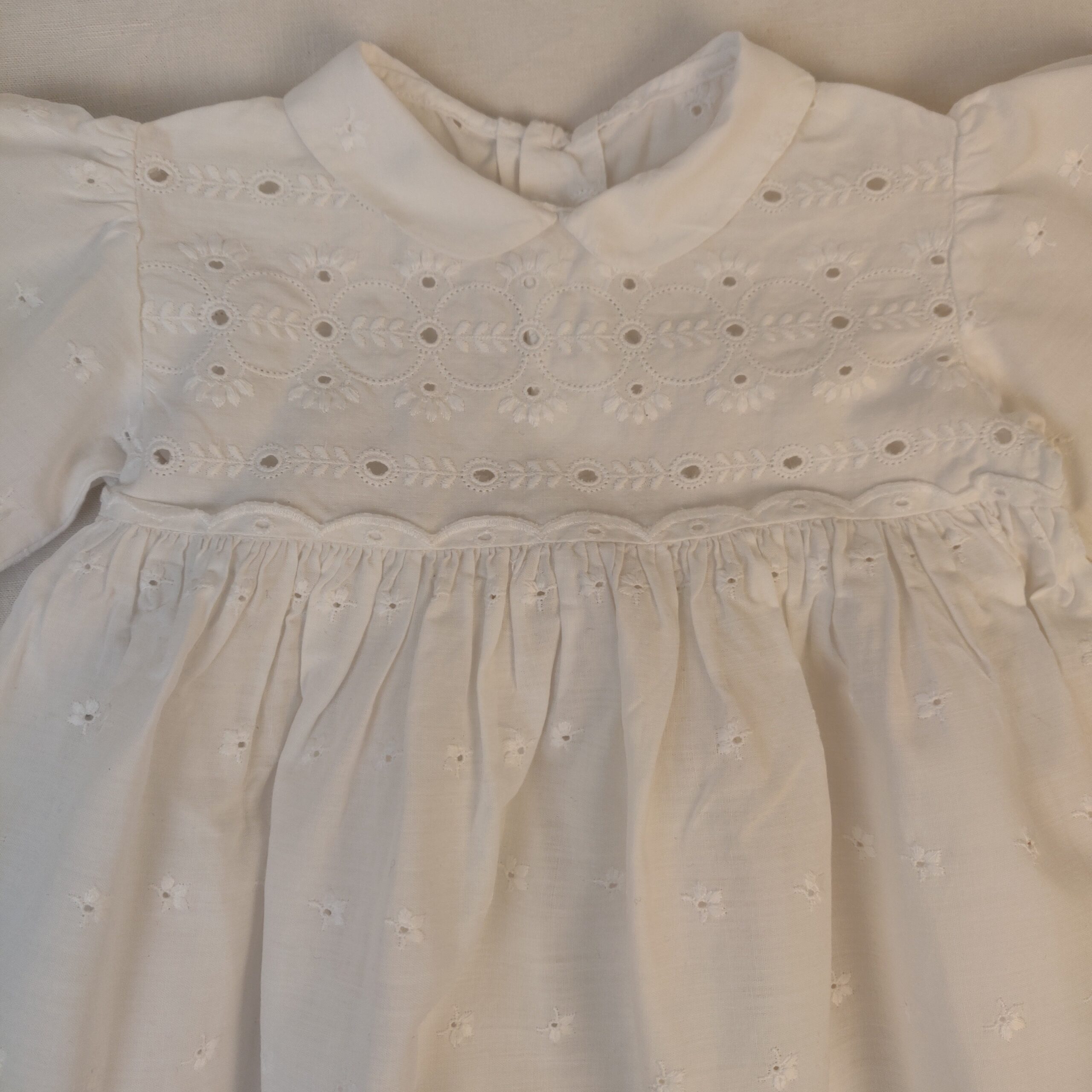 - Robe de cérémonie vintage idéale pour un baptême. En coton brodé, très longue. Petit défaut, la manche du bras gauche est usée au niveau du poignet (entre deux broderies, c’est assez discret).