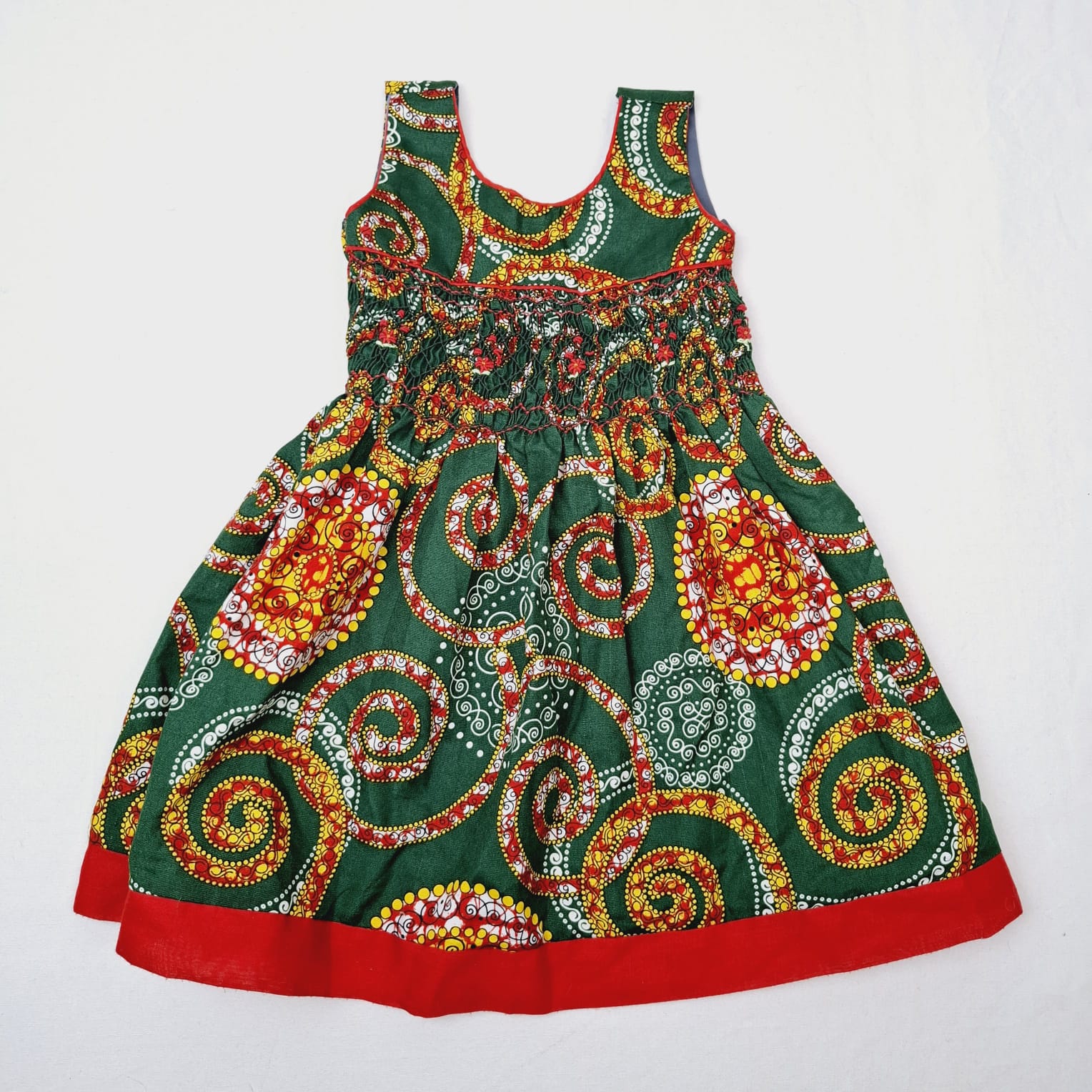 Autres commentaires : Robe en tissu africain vert sans manches, devant à smocks, fermeture par ceinture de serrage.