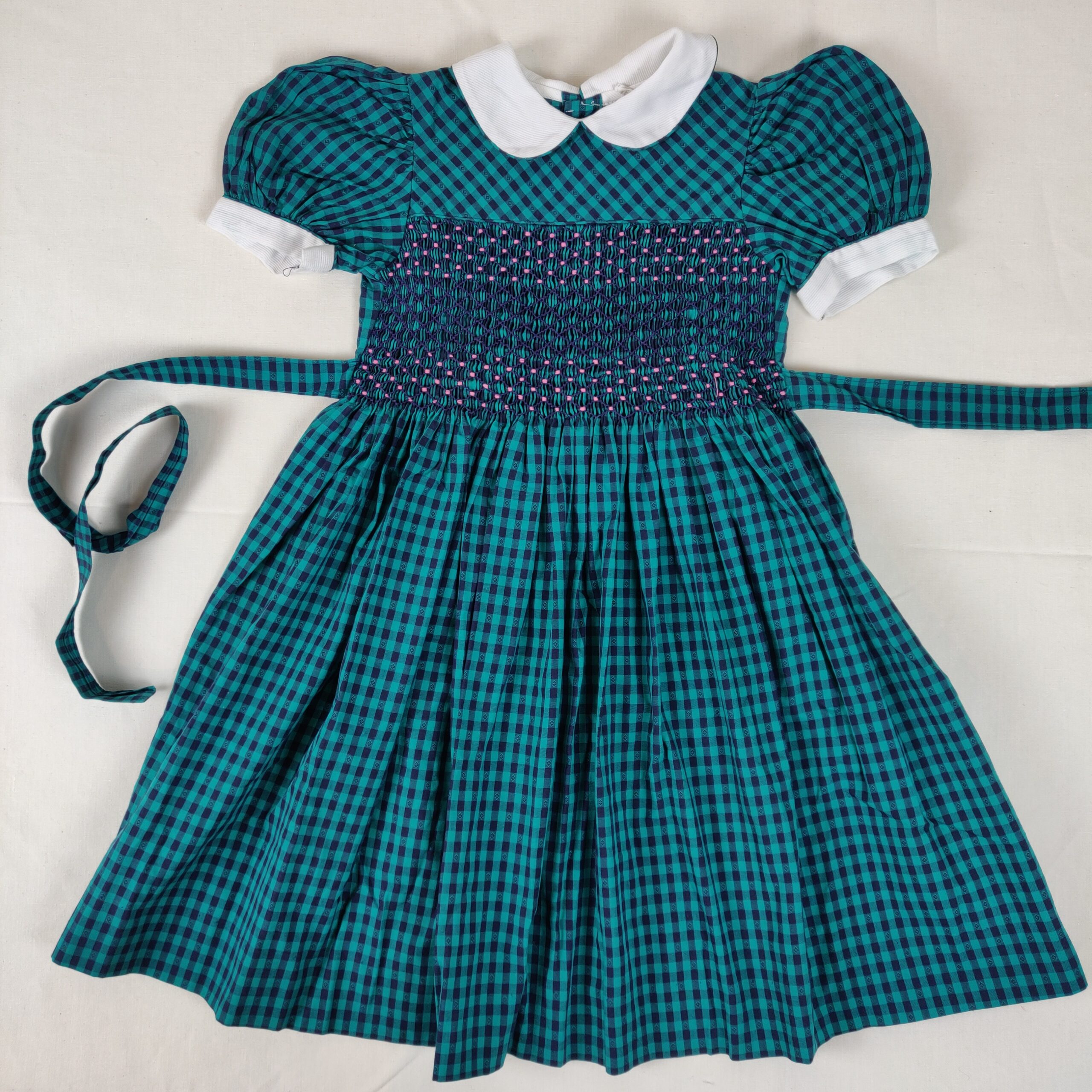 Autres commentaires : 45% polyester. Robe à carreaux bleu marine et vert, manches courtes ballon, col claudine à liseré vert et bleu, smocks à pois roses. Ceinture à l’arrière, fermeture par 4 boutons au dos. Fabriquée aux Philippines.