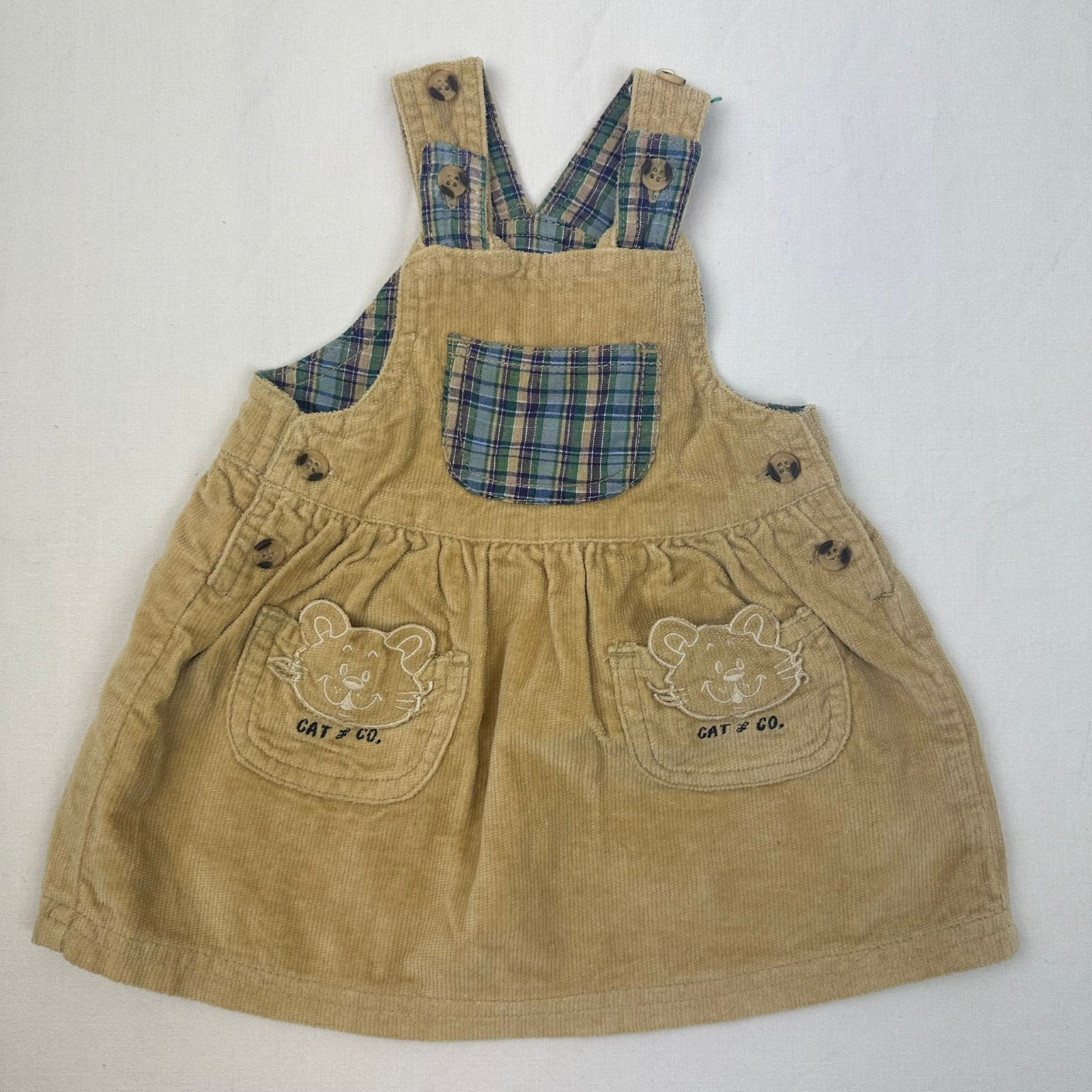 Autres commentaires : Robe marron en bretelles avec une fermeture latérales par boutons et au niveau des manches et motif 2 petites tête de chat sous forme de poche.