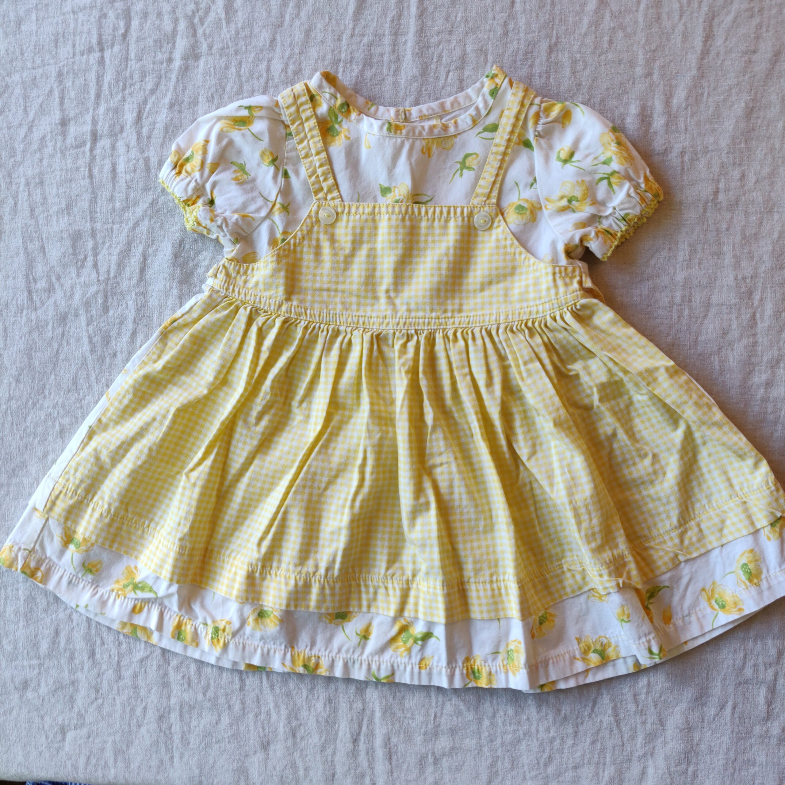 Autres commentaires : Robe à petites manches froncées au motif fleurs jaunes avec effet tablier vichy jaune et blanc sur le devant – entièrement déboutonnable dans le dos