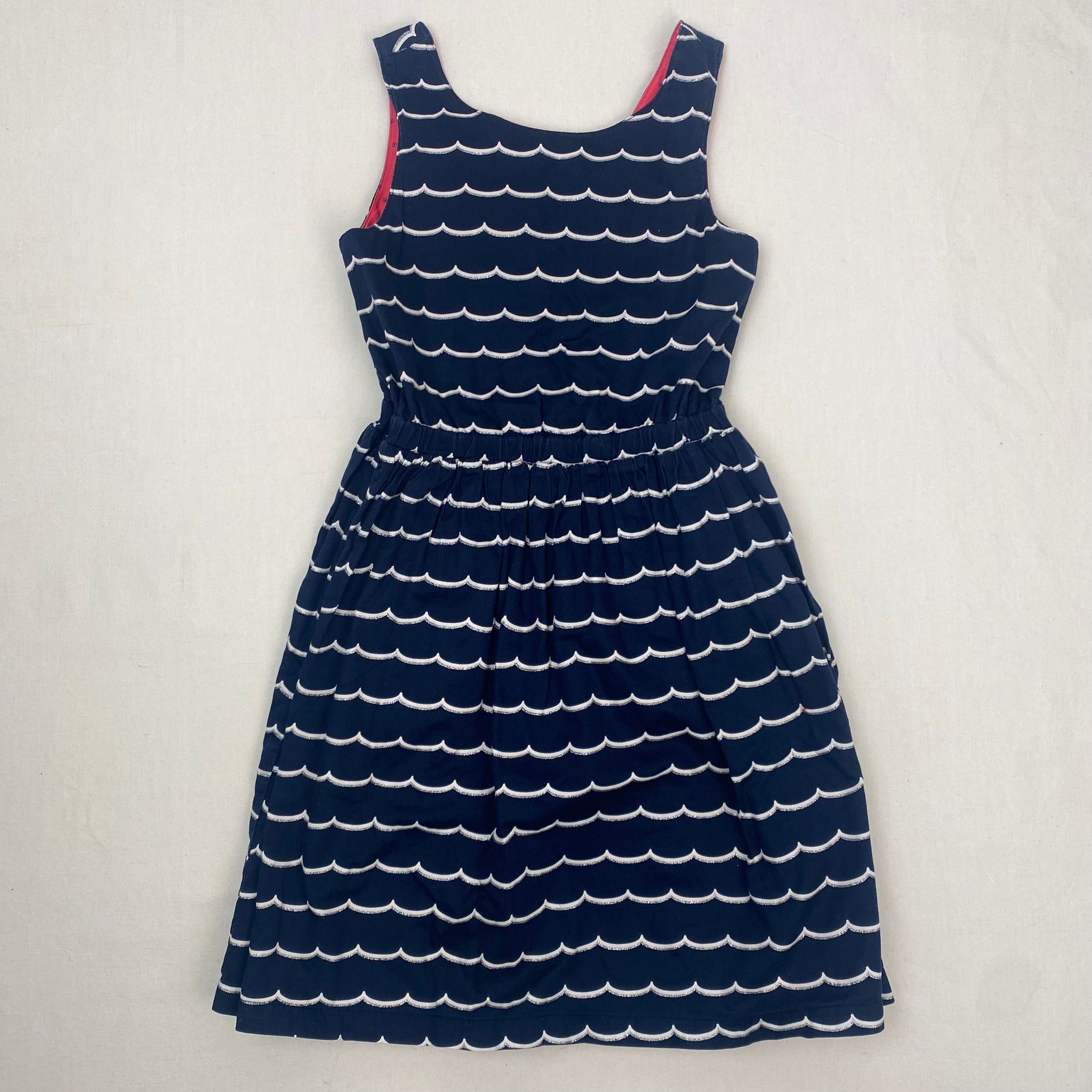 Autres commentaires : Robe bleu foncé manches courtes, ouverture dans le dos, taille élastiquée.